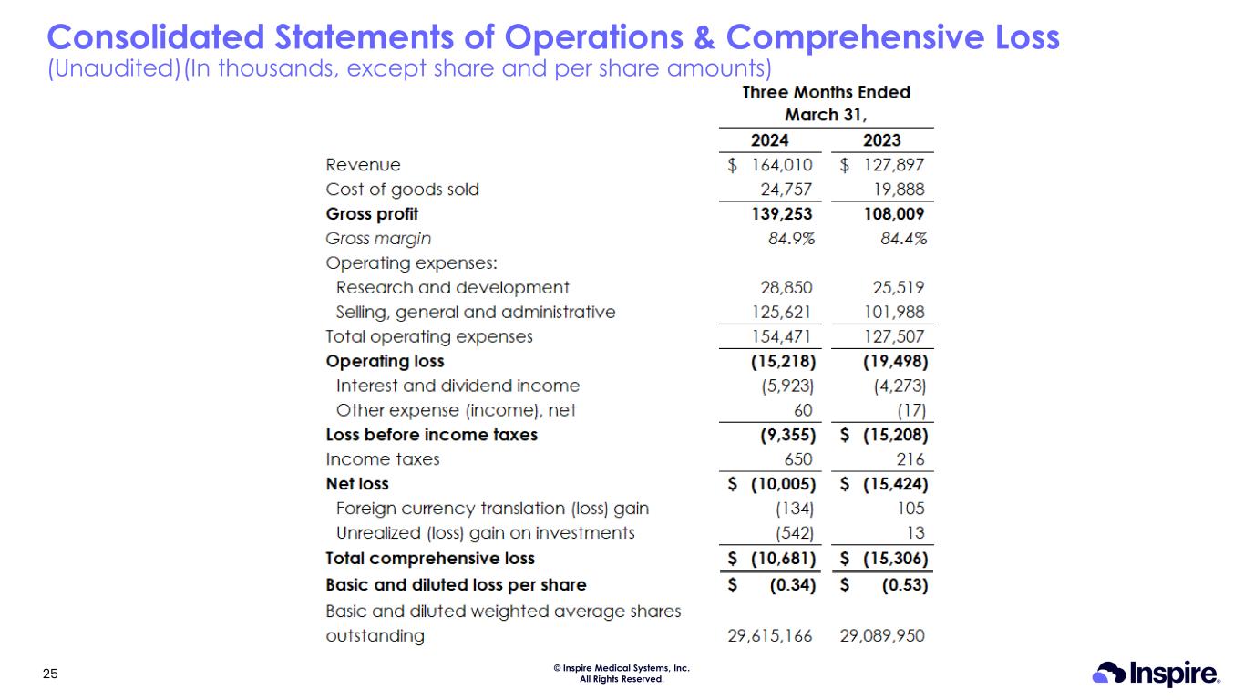 MINNEAPOLIS, Minnesota - May 7, 2024 - Inspire Medical Systems, Inc. (NYSE: INSP) (Inspire), a medical technology company focused on the development and commercialization of innovative, minimally invasive solutions for patients with obstructive sleep apnea, today reported financial results for the quarter ended March 31, 2024.