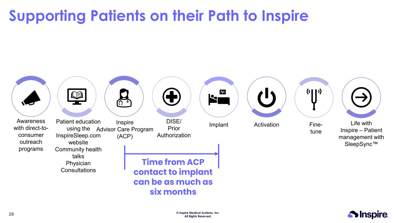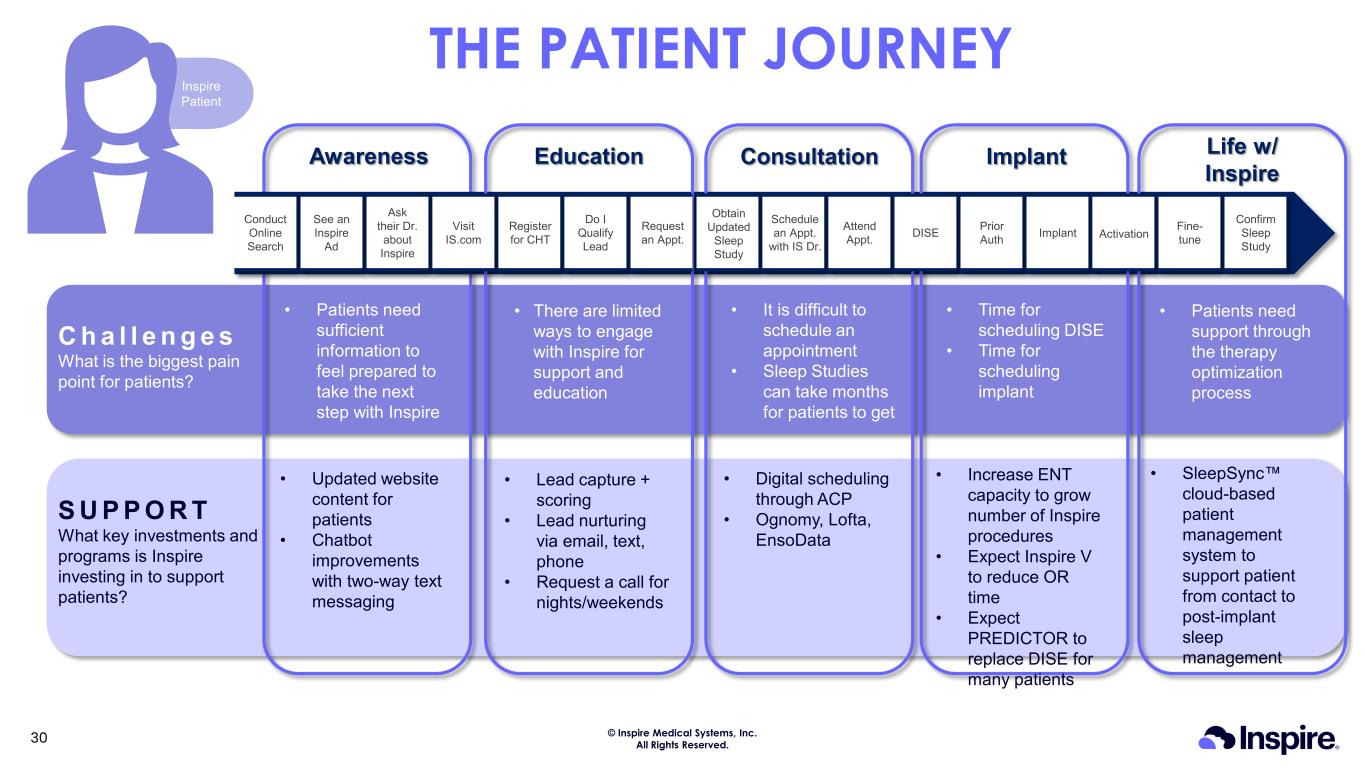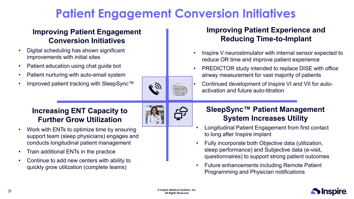 © Inspire Medical Systems, Inc. All Rights Reserved. Inspire Patient THE PATIENT JOURNEY Awareness Education Consultation Implant Life w/ Inspire Confirm Sleep Study Fine- tuneActivationImplantPrior AuthDISE Conduct Online Search Attend Appt. Schedule an Appt. with IS Dr. Obtain Updated Sleep Study Request an Appt. Do I Qualify Lead Register for CHT Visit IS.com Ask their Dr. about Inspire See an Inspire Ad C h a l l e n g e s What is the biggest pain point for patients? S U P P O R T What key investments and programs is Inspire investing in to support patients? • Patients need sufficient information to feel prepared to take the next step with Inspire • There are limited ways to engage with Inspire for support and education • It is difficult to schedule an appointment • Sleep Studies can take months for patients to get • Time for scheduling DISE • Time for scheduling implant • Patients need support through the therapy optimization process • Lead capture + scoring • Lead nurturing via email, text, phone • Request a call for nights/weekends • Updated website content for patients • Chatbot improvements with two-way text messaging • Digital scheduling through ACP • Ognomy, Lofta, EnsoData • Increase ENT capacity to grow number of Inspire procedures • Expect Inspire V to reduce OR time • Expect PREDICTOR to replace DISE for many patients • SleepSync cloud-based patient management system to support patient from contact to post-implant sleep management 30