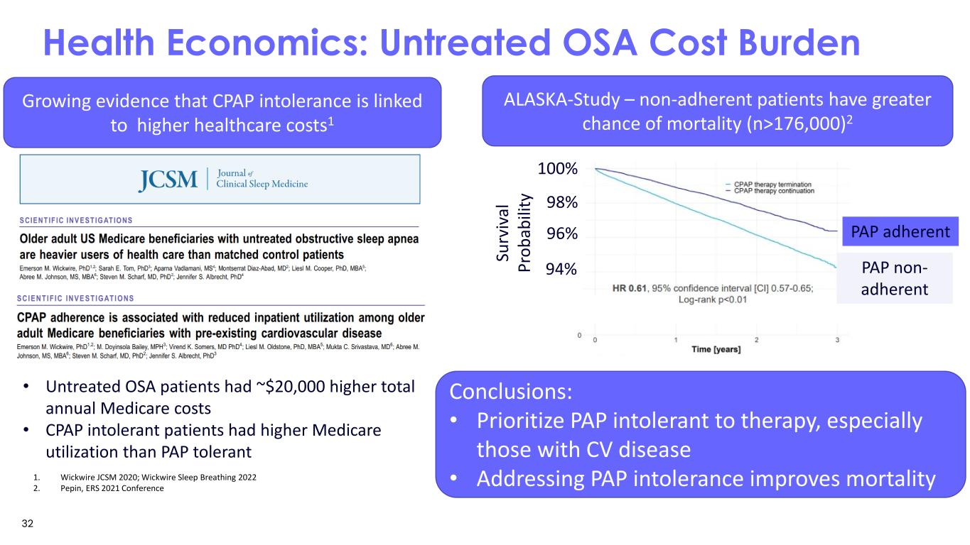 Health Economics: Untreated OSA Cost Burden • Untreated OSA patients had ~$20,000 higher total annual Medicare costs • CPAP intolerant patients had higher Medicare utilization than PAP tolerant ALASKA-Study – non-adherent patients have greater chance of mortality (n>176,000)2 PAP non- adherent PAP adherent96% 98% 100% Su rv iv al Pr ob ab ili ty Conclusions: • Prioritize PAP intolerant to therapy, especially those with CV disease • Addressing PAP intolerance improves mortality1. Wickwire JCSM 2020; Wickwire Sleep Breathing 2022 2. Pepin, ERS 2021 Conference Growing evidence that CPAP intolerance is linked to higher healthcare costs1 94% 32