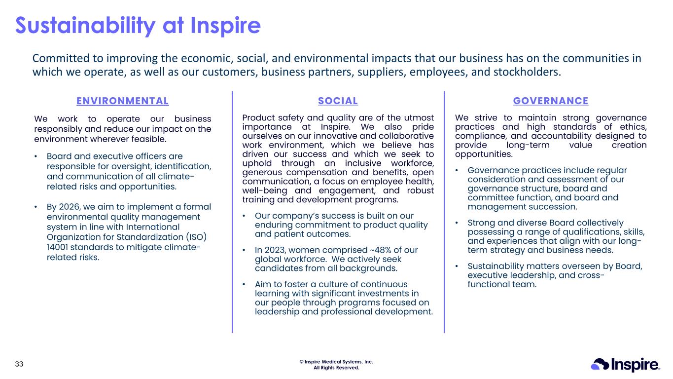 © Inspire Medical Systems, Inc. All Rights Reserved. Sustainability at Inspire 33 Committed to improving the economic, social, and environmental impacts that our business has on the communities in which we operate, as well as our customers, business partners, suppliers, employees, and stockholders. ENVIRONMENTAL We work to operate our business responsibly and reduce our impact on the environment wherever feasible. • Board and executive officers are responsible for oversight, identification, and communication of all climate- related risks and opportunities. • By 2026, we aim to implement a formal environmental quality management system in line with International Organization for Standardization (ISO) 14001 standards to mitigate climate- related risks. SOCIAL Product safety and quality are of the utmost importance at Inspire. We also pride ourselves on our innovative and collaborative work environment, which we believe has driven our success and which we seek to uphold through an inclusive workforce, generous compensation and benefits, open communication, a focus on employee health, well-being and engagement, and robust training and development programs. • Our company’s success is built on our enduring commitment to product quality and patient outcomes. • In 2023, women comprised ~48% of our global workforce. We actively seek candidates from all backgrounds. • Aim to foster a culture of continuous learning with significant investments in our people through programs focused on leadership and professional development. GOVERNANCE We strive to maintain strong governance practices and high standards of ethics, compliance, and accountability designed to provide long-term value creation opportunities. • Governance practices include regular consideration and assessment of our governance structure, board and committee function, and board and management succession. • Strong and diverse Board collectively possessing a range of qualifications, skills, and experiences that align with our long- term strategy and business needs. • Sustainability matters overseen by Board, executive leadership, and cross- functional team.