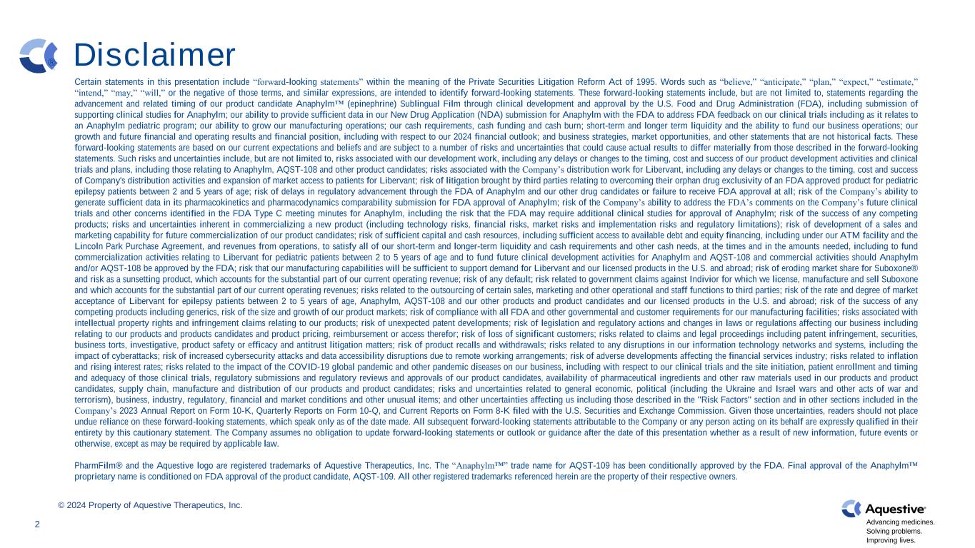 Advancing medicines. Solving problems. Improving lives. 2 ® Disclaimer Certain statements in this presentation include “forward-looking statements” within the meaning of the Private Securities Litigation Reform Act of 1995. Words such as “believe,” “anticipate,” “plan,” “expect,” “estimate,” “intend,” “may,” “will,” or the negative of those terms, and similar expressions, are intended to identify forward-looking statements. These forward-looking statements include, but are not limited to, statements regarding the advancement and related timing of our product candidate Anaphylm (epinephrine) Sublingual Film through clinical development and approval by the U.S. Food and Drug Administration (FDA), including submission of supporting clinical studies for Anaphylm; our ability to provide sufficient data in our New Drug Application (NDA) submission for Anaphylm with the FDA to address FDA feedback on our clinical trials including as it relates to an Anaphylm pediatric program; our ability to grow our manufacturing operations; our cash requirements, cash funding and cash burn; short-term and longer term liquidity and the ability to fund our business operations; our growth and future financial and operating results and financial position, including with respect to our 2024 financial outlook; and business strategies, market opportunities, and other statements that are not historical facts. These forward-looking statements are based on our current expectations and beliefs and are subject to a number of risks and uncertainties that could cause actual results to differ materially from those described in the forward-looking statements. Such risks and uncertainties include, but are not limited to, risks associated with our development work, including any delays or changes to the timing, cost and success of our product development activities and clinical trials and plans, including those relating to Anaphylm, AQST-108 and other product candidates; risks associated with the Company’s distribution work for Libervant, including any delays or changes to the timing, cost and success of Company's distribution activities and expansion of market access to patients for Libervant; risk of litigation brought by third parties relating to overcoming their orphan drug exclusivity of an FDA approved product for pediatric epilepsy patients between 2 and 5 years of age; risk of delays in regulatory advancement through the FDA of Anaphylm and our other drug candidates or failure to receive FDA approval at all; risk of the Company’s ability to generate sufficient data in its pharmacokinetics and pharmacodynamics comparability submission for FDA approval of Anaphylm; risk of the Company’s ability to address the FDA’s comments on the Company’s future clinical trials and other concerns identified in the FDA Type C meeting minutes for Anaphylm, including the risk that the FDA may require additional clinical studies for approval of Anaphylm; risk of the success of any competing products; risks and uncertainties inherent in commercializing a new product (including technology risks, financial risks, market risks and implementation risks and regulatory limitations); risk of development of a sales and marketing capability for future commercialization of our product candidates; risk of sufficient capital and cash resources, including sufficient access to available debt and equity financing, including under our ATM facility and the Lincoln Park Purchase Agreement, and revenues from operations, to satisfy all of our short-term and longer-term liquidity and cash requirements and other cash needs, at the times and in the amounts needed, including to fund commercialization activities relating to Libervant for pediatric patients between 2 to 5 years of age and to fund future clinical development activities for Anaphylm and AQST-108 and commercial activities should Anaphylm and/or AQST-108 be approved by the FDA; risk that our manufacturing capabilities will be sufficient to support demand for Libervant and our licensed products in the U.S. and abroad; risk of eroding market share for Suboxone® and risk as a sunsetting product, which accounts for the substantial part of our current operating revenue; risk of any default; risk related to government claims against Indivior for which we license, manufacture and sell Suboxone and which accounts for the substantial part of our current operating revenues; risks related to the outsourcing of certain sales, marketing and other operational and staff functions to third parties; risk of the rate and degree of market acceptance of Libervant for epilepsy patients between 2 to 5 years of age, Anaphylm, AQST-108 and our other products and product candidates and our licensed products in the U.S. and abroad; risk of the success of any competing products including generics, risk of the size and growth of our product markets; risk of compliance with all FDA and other governmental and customer requirements for our manufacturing facilities; risks associated with intellectual property rights and infringement claims relating to our products; risk of unexpected patent developments; risk of legislation and regulatory actions and changes in laws or regulations affecting our business including relating to our products and products candidates and product pricing, reimbursement or access therefor; risk of loss of significant customers; risks related to claims and legal proceedings including patent infringement, securities, business torts, investigative, product safety or efficacy and antitrust litigation matters; risk of product recalls and withdrawals; risks related to any disruptions in our information technology networks and systems, including the impact of cyberattacks; risk of increased cybersecurity attacks and data accessibility disruptions due to remote working arrangements; risk of adverse developments affecting the financial services industry; risks related to
