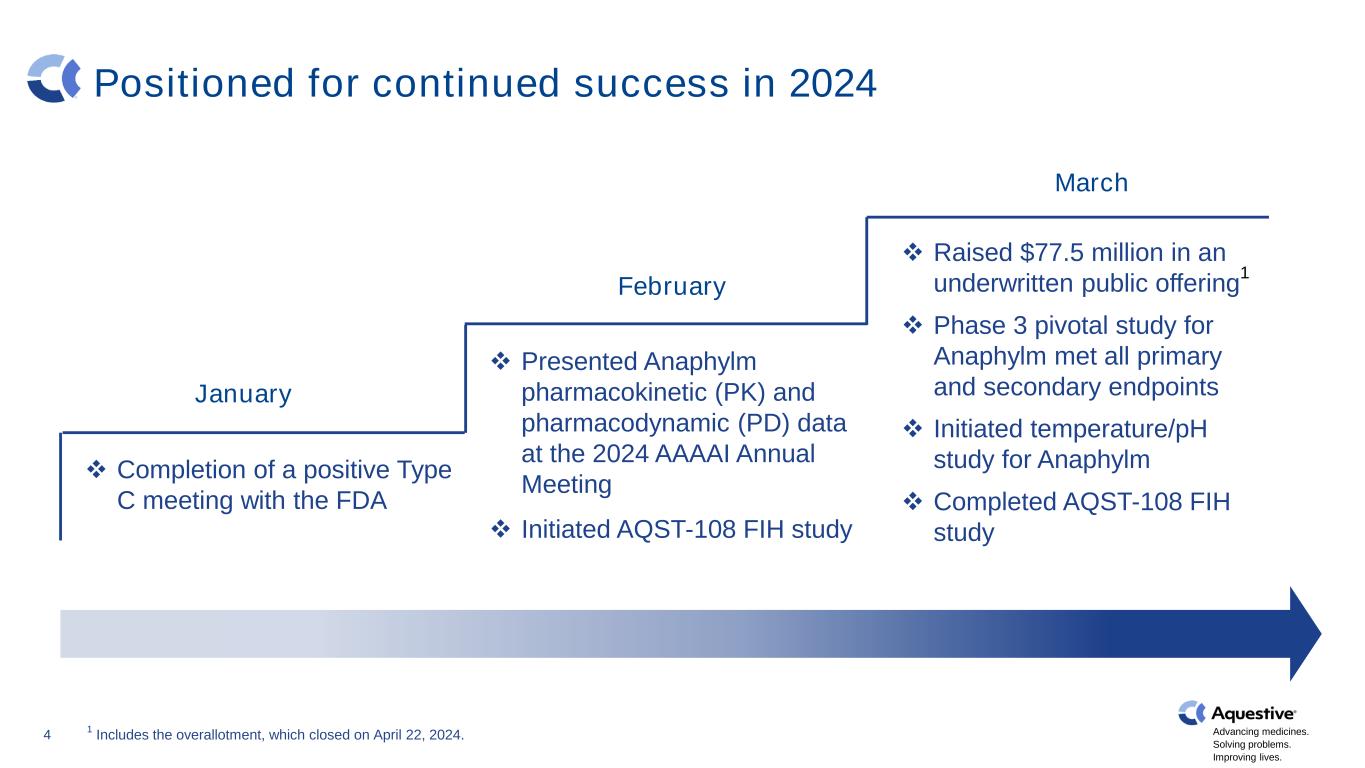 Advancing medicines. Solving problems. Improving lives. 3 Q1 2024 Earnings: Key Messages AnaphylmTM (epinephrine) Sublingual Film ❖ Pivotal study met all primary and secondary endpoints ❖ Successful completion of a Type C meeting with the FDA ❖ On track for goal of submitting a New Drug Application (NDA) before year-end 2024 LibervantTM (diazepam) Buccal Film ❖ Received FDA approval for Libervant for patients between the ages of two and five years old ❖ Product is immediately available to non-Medicaid patients AQST-108 (epinephrine) Topical Gel ❖ Positive results from first-in-human (FIH) study Strengthened the Balance Sheet ❖ Finished first quarter 2024 with a cash balance of approximately $95 million ❖ Raised $77.5 million through an underwritten public offering at a public offering price of $4.50 per share of common stock 1 ➢ Provides sufficient cash to fund both the Anaphylm program and Company operations ➢ Extends cash runway into 2026 1 Includes the overallotment, which closed on April 22, 2024.