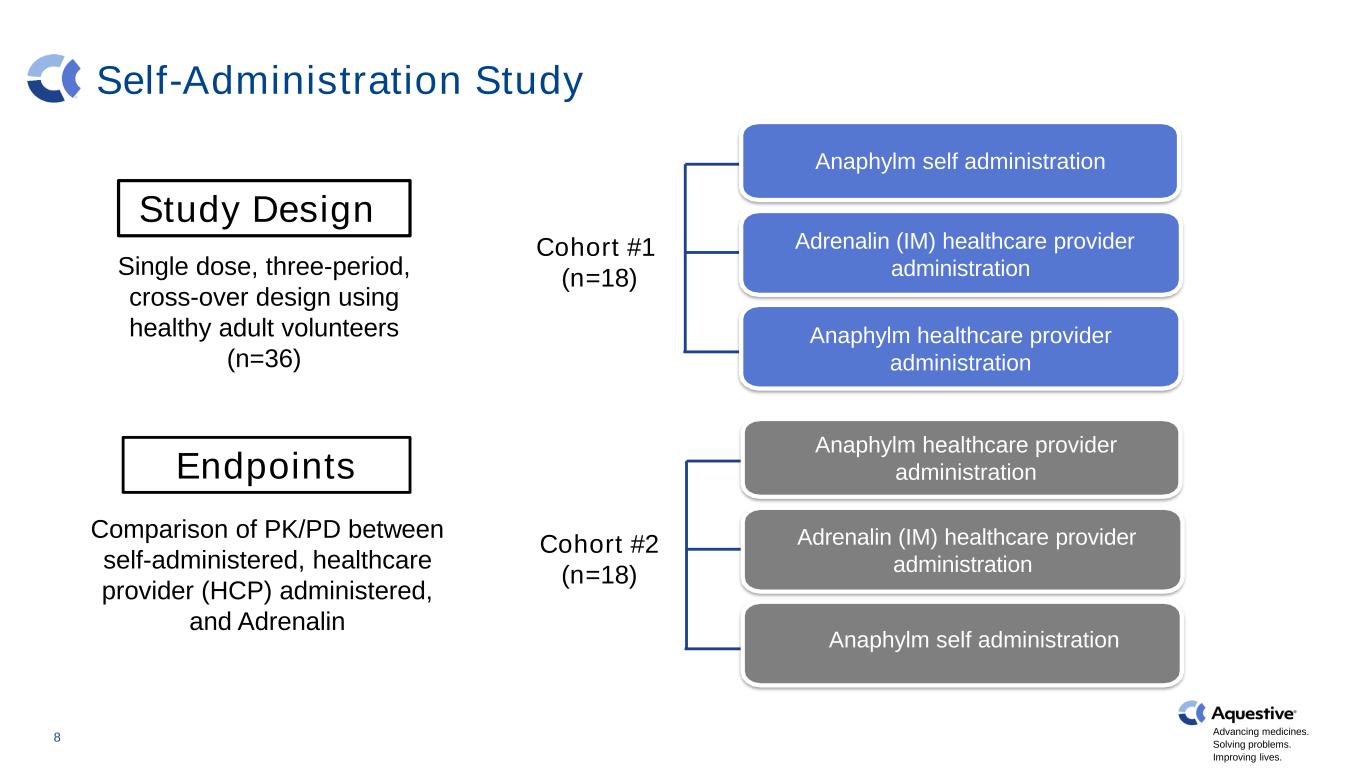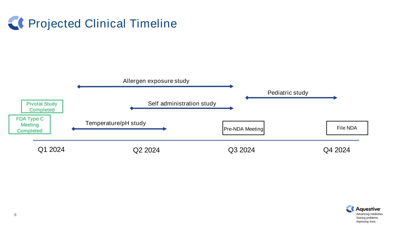 Aquestive is conducting the additional studies for Anaphylm in line with its stated timeline. The temperature/pH study is fully enrolled and expected to be completed in the second quarter 2024. FDA feedback on the self-administration study and allergen exposure study was recently received, and the Company remains on track to complete both studies in the third quarter 2024. The pediatric study, in patients from the ages of 7 to 17 (weight greater than or equal to 30kgs), is planned to commence in the second half of 2024 based on feedback from the FDA.