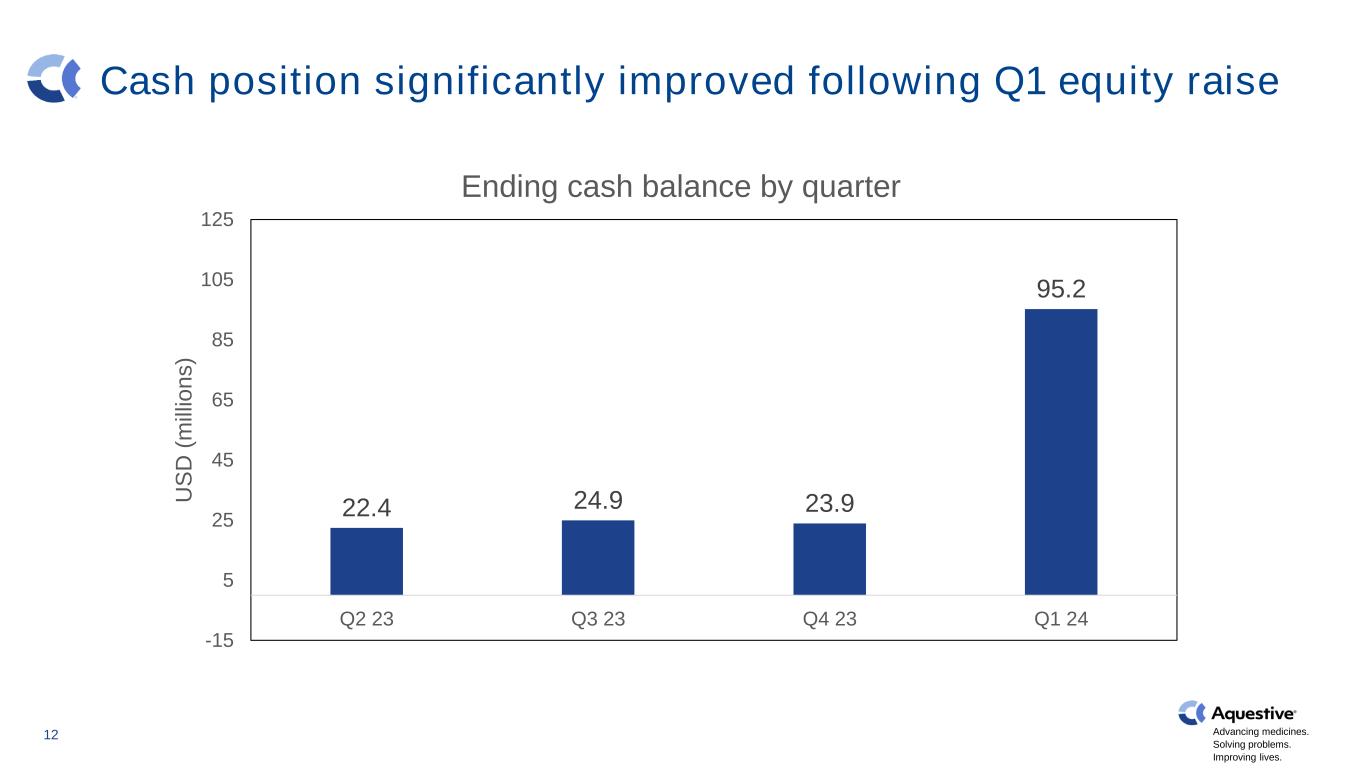 Advancing medicines. Solving problems. Improving lives. Cash position significantly improved following Q1 equity raise 12 22.4 24.9 23.9 95.2 -15 5 25 45 65 85 105 125 Q2 23 Q3 23 Q4 23 Q1 24 U S D ( m ill io n s ) Ending cash balance by quarter