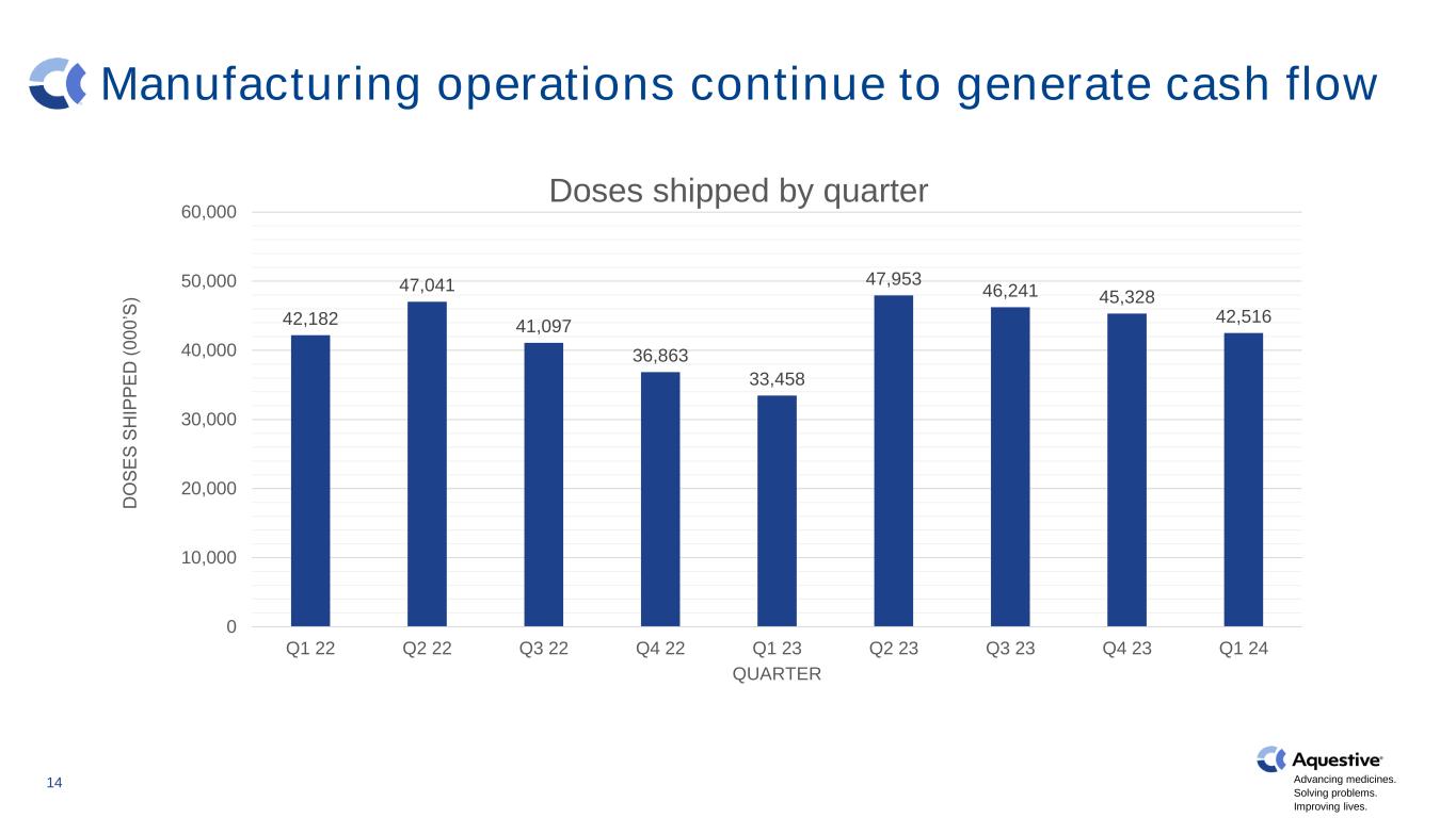 Advancing medicines. Solving problems. Improving lives. Manufacturing operations continue to generate cash flow 14 42,182 47,041 41,097 36,863 33,458 47,953 46,241 45,328 42,516 0 10,000 20,000 30,000 40,000 50,000 60,000 Q1 22 Q2 22 Q3 22 Q4 22 Q1 23 Q2 23 Q3 23 Q4 23 Q1 24 D O S E S S H IP P E D ( 0 0 0 ’S ) QUARTER Doses shipped by quarter