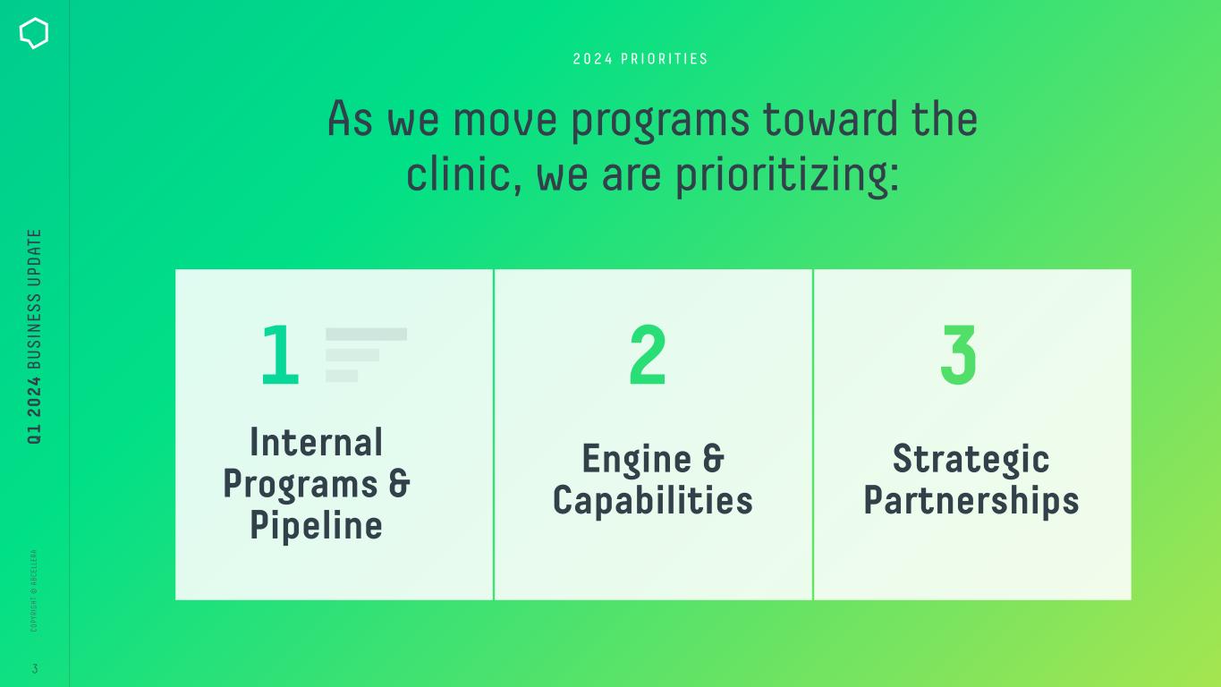 C O PY RI G H T © A B C EL LE RA C O PY RI G H T © A B C EL LE RA 3 As we move programs toward the clinic, we are prioritizing: 2 0 2 4 P R I O R I T I E S Engine & Capabilities Strategic Partnerships Internal Programs & Pipeline 1 2 3 Q 1 2 0 2 4 B U S IN ES S U PD AT E