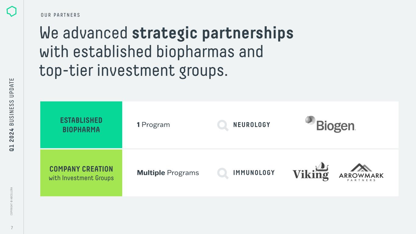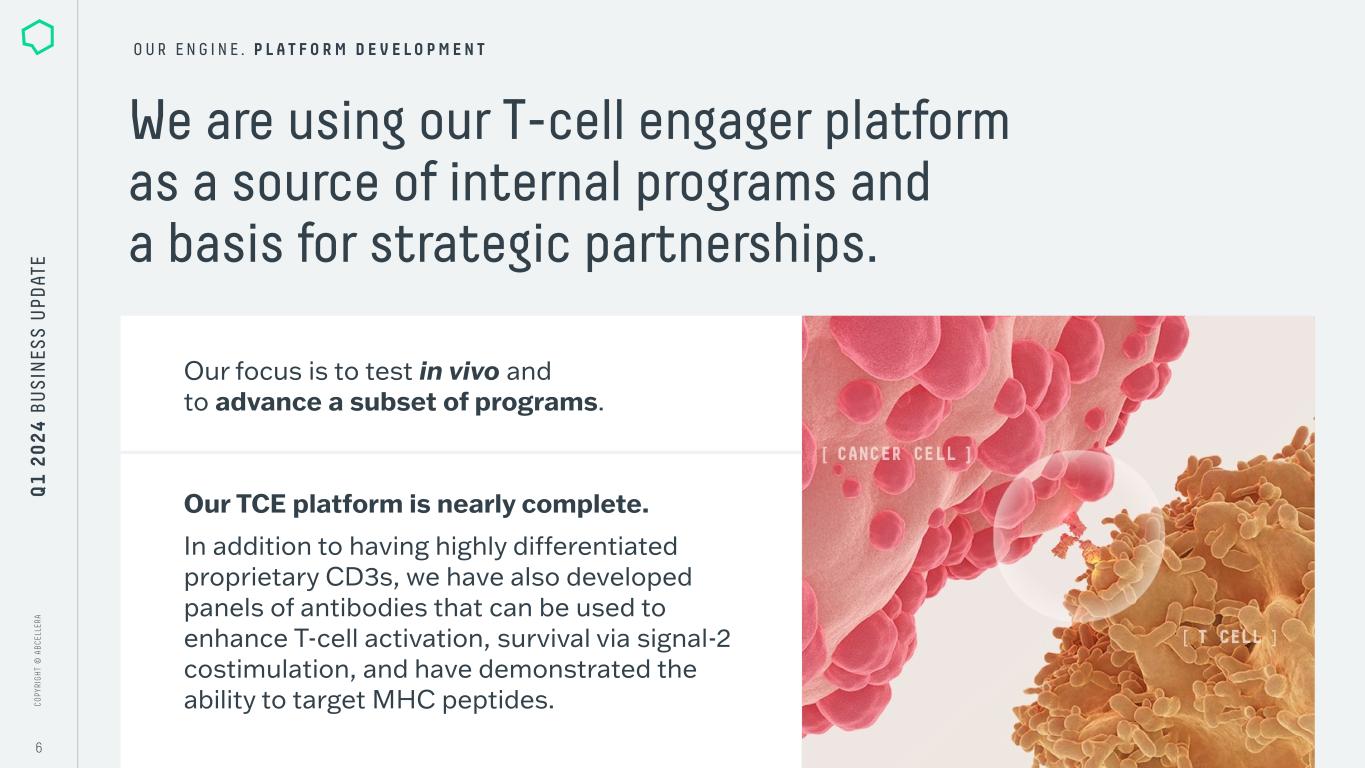 C O PY RI G H T © A B C EL LE RA C O PY RI G H T © A B C EL LE RA 6 Q 1 2 0 2 4 B U S IN ES S U PD AT E We are using our T-cell engager platform as a source of internal programs and a basis for strategic partnerships. Our TCE platform is nearly complete. In addition to having highly differentiated proprietary CD3s, we have also developed panels of antibodies that can be used to enhance T-cell activation, survival via signal-2 costimulation, and have demonstrated the ability to target MHC peptides. O U R E N G I N E . P L A T F O R M D E V E L O P M E N T Our focus is to test in vivo and to advance a subset of programs.