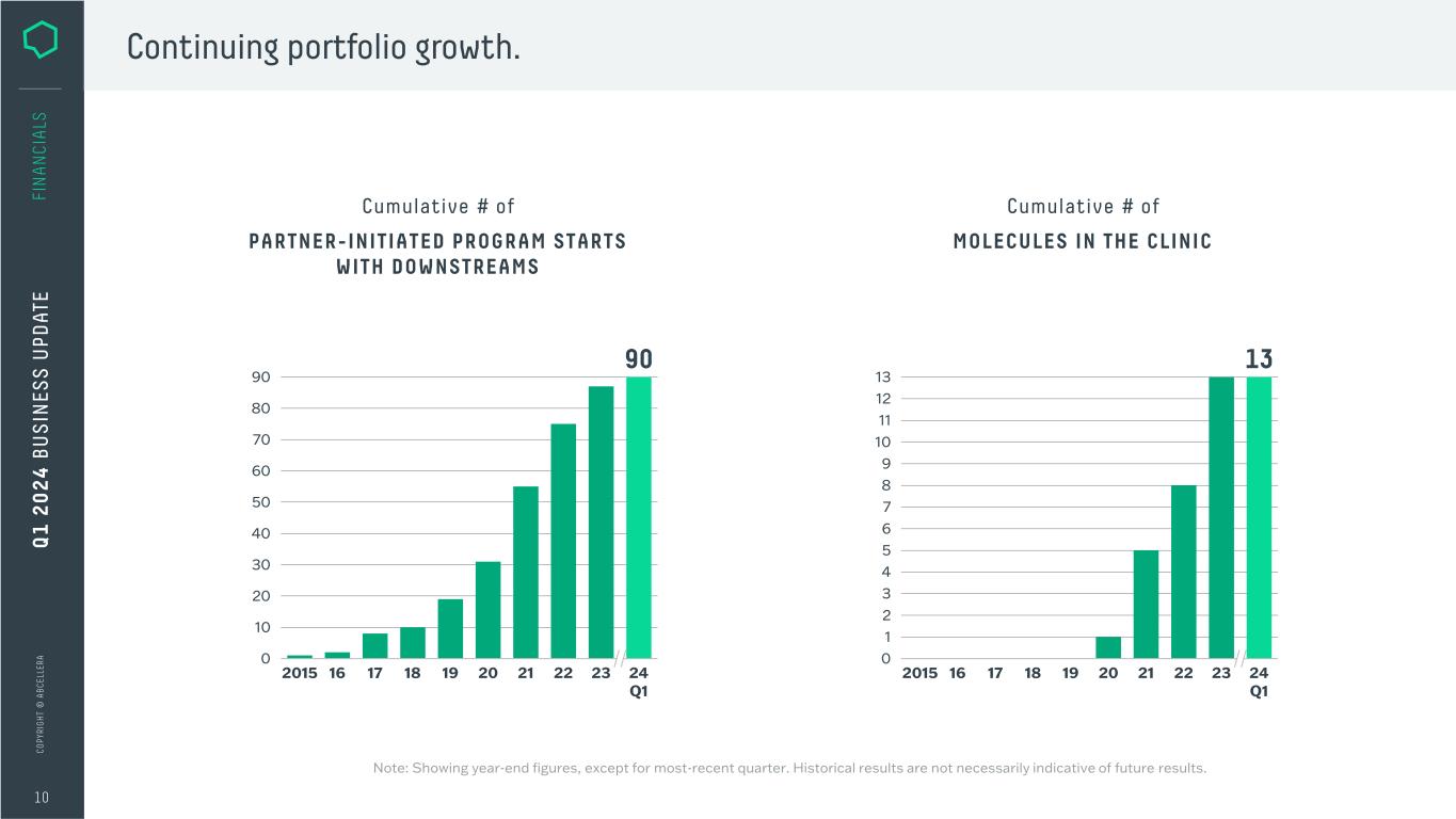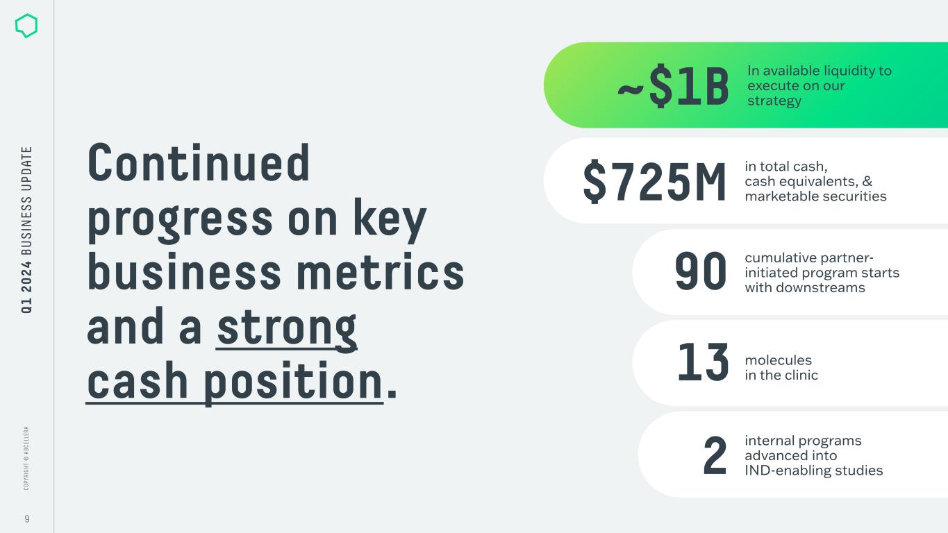 C O PY RI G H T © A B C EL LE RA C O PY RI G H T © A B C EL LE RA 9 Q 1 2 0 2 4 B U S IN ES S U PD AT E Continued progress on key business metrics and a strong cash position. in total cash, cash equivalents, & marketable securities cumulative partner- initiated program starts with downstreams internal programs advanced into IND-enabling studies $725M 90 2 molecules in the clinic13 In available liquidity to execute on our strategy~$1B