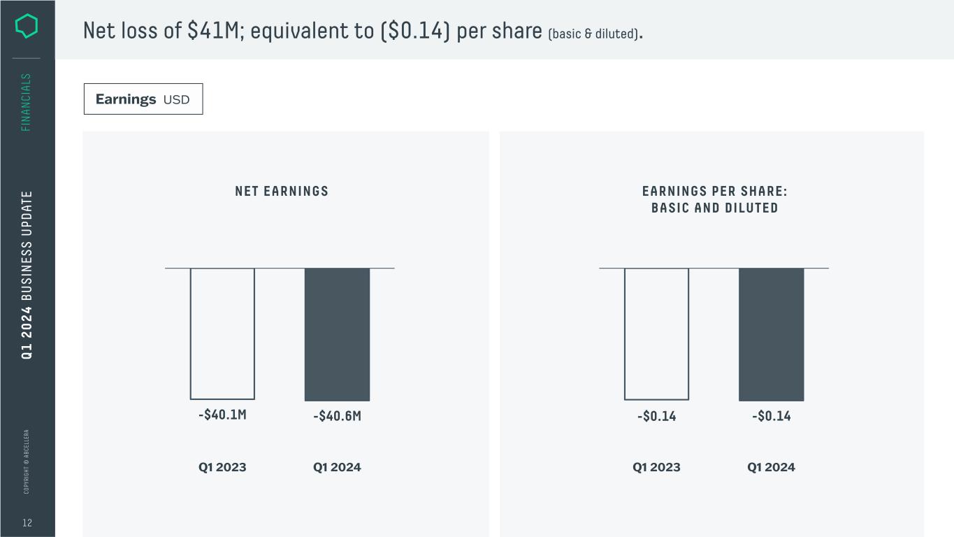 C O PY RI G H T © A B C EL LE RA 12 FI N A N CI A LS Net loss of $41M; equivalent to ($0.14) per share (basic & diluted). NET EARNINGS EARNINGS PER SHARE: BASIC AND DILUTED Q1 2023 Q1 2024 -$40.1M -$40.6M -$0.14 -$0.14 Q1 2023 Q1 2024 Q 1 2 0 2 4 B U S IN ES S U PD AT E Earnings USD