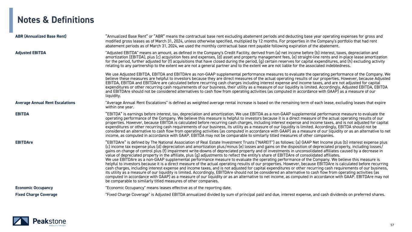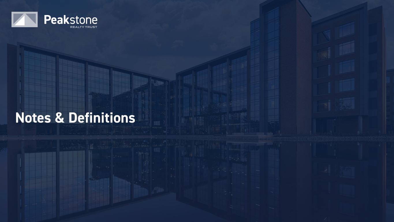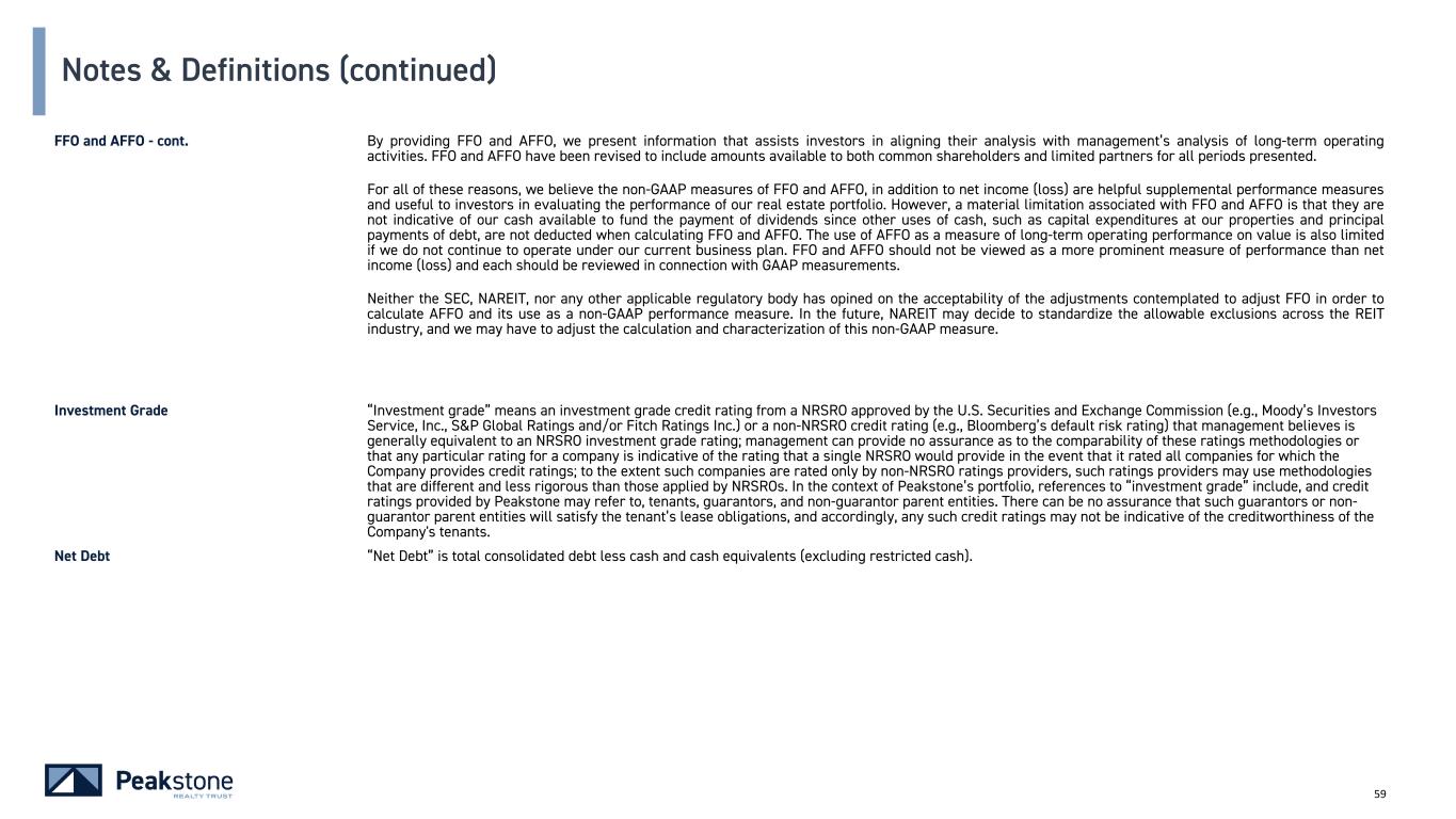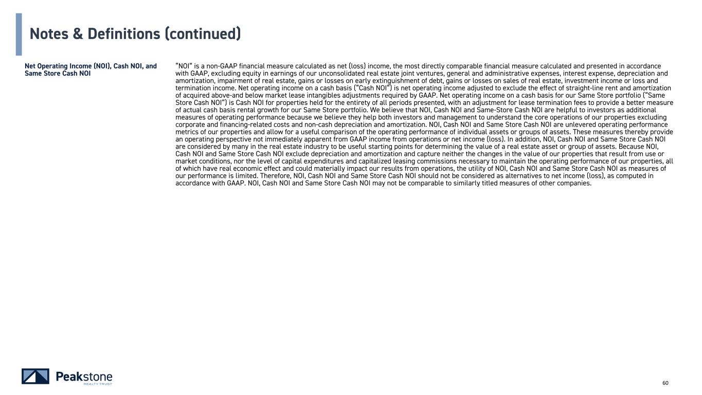 59 Notes & Definitions (continued) FFO and AFFO - cont. By providing FFO and AFFO, we present information that assists investors in aligning their analysis with management’s analysis of long-term operating activities. FFO and AFFO have been revised to include amounts available to both common shareholders and limited partners for all periods presented. For all of these reasons, we believe the non-GAAP measures of FFO and AFFO, in addition to net income (loss) are helpful supplemental performance measures and useful to investors in evaluating the performance of our real estate portfolio. However, a material limitation associated with FFO and AFFO is that they are not indicative of our cash available to fund the payment of dividends since other uses of cash, such as capital expenditures at our properties and principal payments of debt, are not deducted when calculating FFO and AFFO. The use of AFFO as a measure of long-term operating performance on value is also limited if we do not continue to operate under our current business plan. FFO and AFFO should not be viewed as a more prominent measure of performance than net income (loss) and each should be reviewed in connection with GAAP measurements. Neither the SEC, NAREIT, nor any other applicable regulatory body has opined on the acceptability of the adjustments contemplated to adjust FFO in order to calculate AFFO and its use as a non-GAAP performance measure. In the future, NAREIT may decide to standardize the allowable exclusions across the REIT industry, and we may have to adjust the calculation and characterization of this non-GAAP measure. Investment Grade “Investment grade” means an investment grade credit rating from a NRSRO approved by the U.S. Securities and Exchange Commission (e.g., Moody’s Investors Service, Inc., S&P Global Ratings and/or Fitch Ratings Inc.) or a non-NRSRO credit rating (e.g., Bloomberg’s default risk rating) that management believes is generally equivalent to an NRSRO investment grade rating; management can provide no assurance as to the comparability of these ratings methodologies or that any particular rating for a company is indicative of the rating that a single NRSRO would provide in the event that it rated all companies for which the Company provides credit ratings; to the extent such companies are rated only by non-NRSRO ratings providers, such ratings providers may use methodologies that are different and less rigorous than those applied by NRSROs. In the context of Peakstone’s portfolio, references to “investment grade” include, and credit ratings provided by Peakstone may refer to, tenants, guarantors, and non-guarantor parent entities. There can be no assurance that such guarantors or non- guarantor parent entities will satisfy the tenant’s lease obligations, and accordingly, any such credit ratings may not be indicative of the creditworthiness of the Company's tenants. Net Debt “Net Debt” is total consolidated debt less cash and cash equivalents (excluding restricted cash).