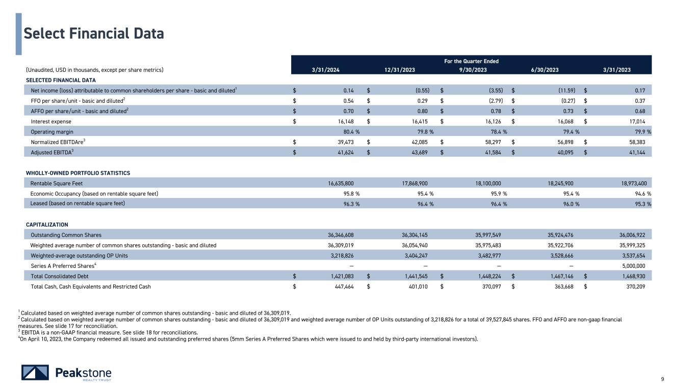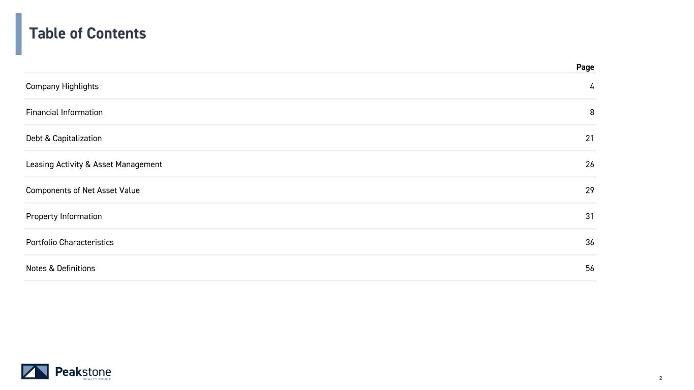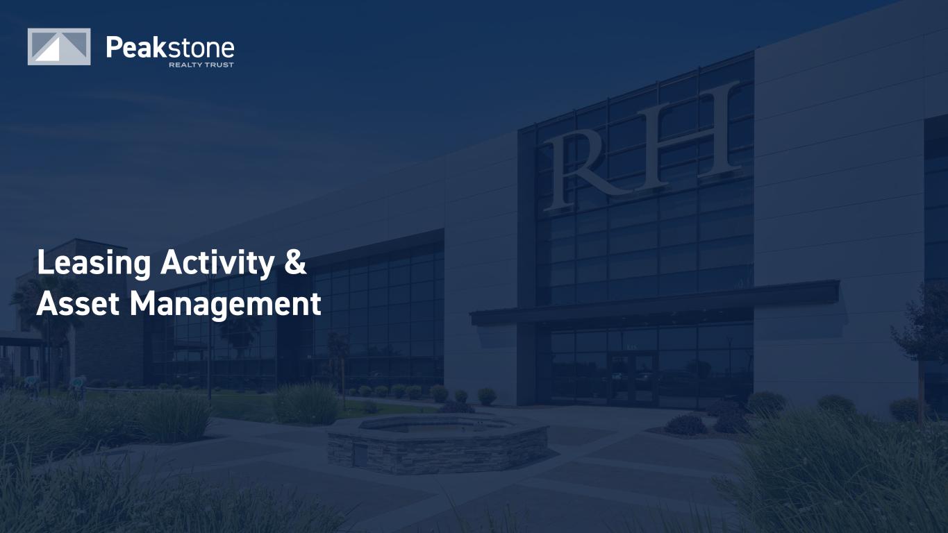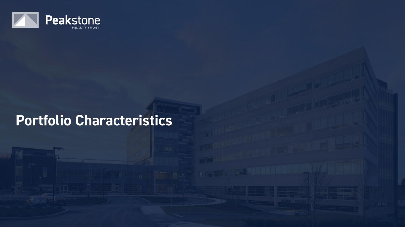 59 Notes & Definitions (continued) FFO and AFFO - cont. By providing FFO and AFFO, we present information that assists investors in aligning their analysis with management’s analysis of long-term operating activities. FFO and AFFO have been revised to include amounts available to both common shareholders and limited partners for all periods presented. For all of these reasons, we believe the non-GAAP measures of FFO and AFFO, in addition to net income (loss) are helpful supplemental performance measures and useful to investors in evaluating the performance of our real estate portfolio. However, a material limitation associated with FFO and AFFO is that they are not indicative of our cash available to fund the payment of dividends since other uses of cash, such as capital expenditures at our properties and principal payments of debt, are not deducted when calculating FFO and AFFO. The use of AFFO as a measure of long-term operating performance on value is also limited if we do not continue to operate under our current business plan. FFO and AFFO should not be viewed as a more prominent measure of performance than net income (loss) and each should be reviewed in connection with GAAP measurements. Neither the SEC, NAREIT, nor any other applicable regulatory body has opined on the acceptability of the adjustments contemplated to adjust FFO in order to calculate AFFO and its use as a non-GAAP performance measure. In the future, NAREIT may decide to standardize the allowable exclusions across the REIT industry, and we may have to adjust the calculation and characterization of this non-GAAP measure. Investment Grade “Investment grade” means an investment grade credit rating from a NRSRO approved by the U.S. Securities and Exchange Commission (e.g., Moody’s Investors Service, Inc., S&P Global Ratings and/or Fitch Ratings Inc.) or a non-NRSRO credit rating (e.g., Bloomberg’s default risk rating) that management believes is generally equivalent to an NRSRO investment grade rating; management can provide no assurance as to the comparability of these ratings methodologies or that any particular rating for a company is indicative of the rating that a single NRSRO would provide in the event that it rated all companies for which the Company provides credit ratings; to the extent such companies are rated only by non-NRSRO ratings providers, such ratings providers may use methodologies that are different and less rigorous than those applied by NRSROs. In the context of Peakstone’s portfolio, references to “investment grade” include, and credit ratings provided by Peakstone may refer to, tenants, guarantors, and non-guarantor parent entities. There can be no assurance that such guarantors or non- guarantor parent entities will satisfy the tenant’s lease obligations, and accordingly, any such credit ratings may not be indicative of the creditworthiness of the Company's tenants. Net Debt “Net Debt” is total consolidated debt less cash and cash equivalents (excluding restricted cash).