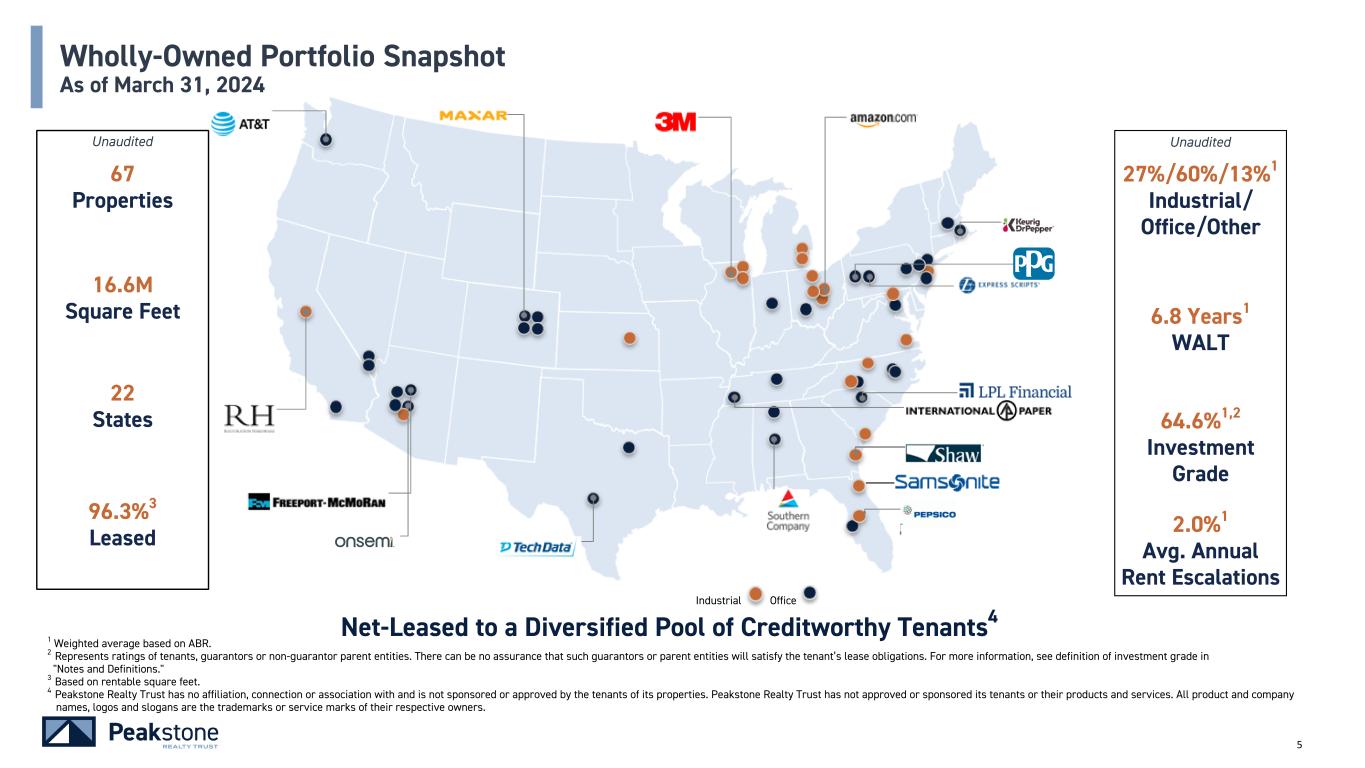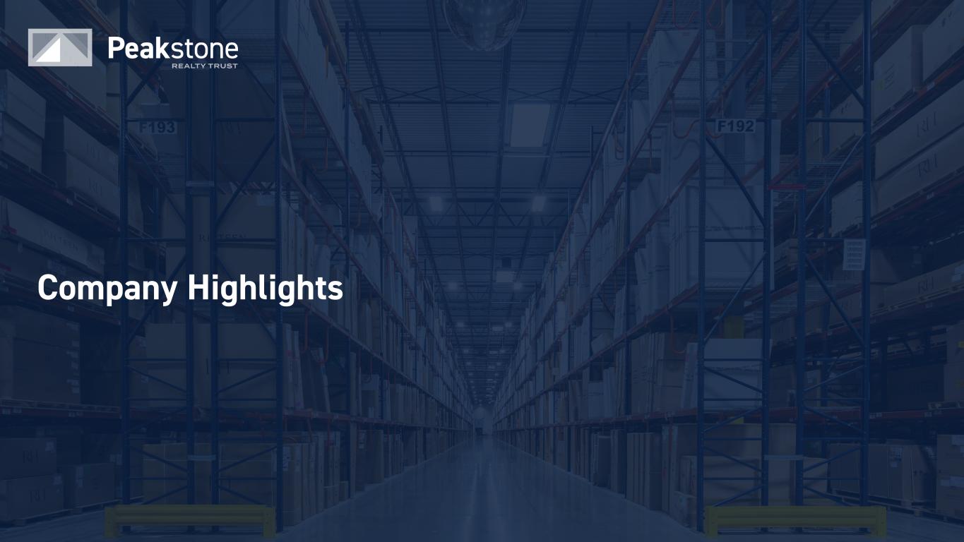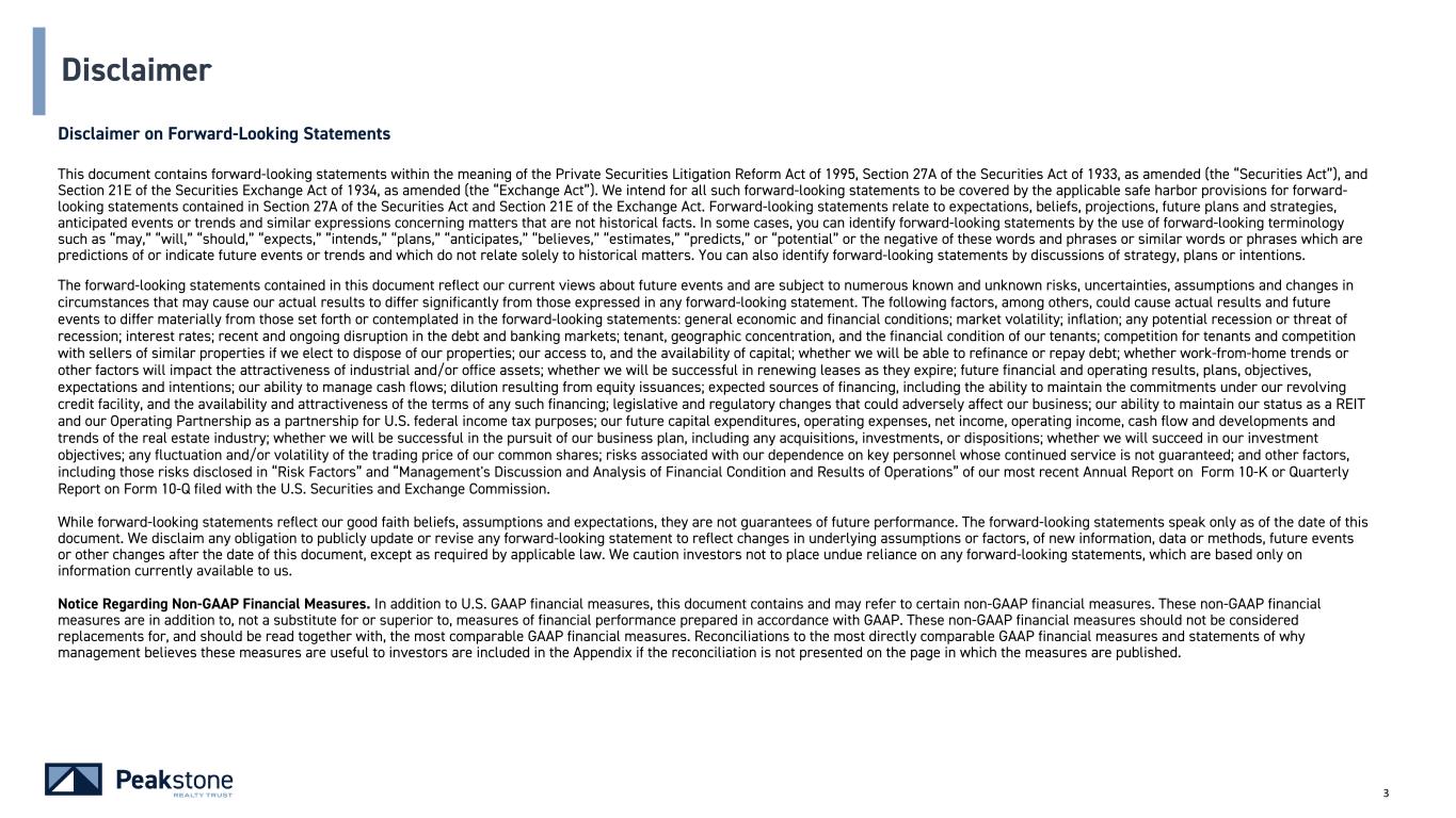 3 Disclaimer Disclaimer on Forward-Looking Statements This document contains forward-looking statements within the meaning of the Private Securities Litigation Reform Act of 1995, Section 27A of the Securities Act of 1933, as amended (the “Securities Act”), and Section 21E of the Securities Exchange Act of 1934, as amended (the “Exchange Act”). We intend for all such forward-looking statements to be covered by the applicable safe harbor provisions for forward- looking statements contained in Section 27A of the Securities Act and Section 21E of the Exchange Act. Forward-looking statements relate to expectations, beliefs, projections, future plans and strategies, anticipated events or trends and similar expressions concerning matters that are not historical facts. In some cases, you can identify forward-looking statements by the use of forward-looking terminology such as “may,” “will,” “should,” “expects,” “intends,” “plans,” “anticipates,” “believes,” “estimates,” “predicts,” or “potential” or the negative of these words and phrases or similar words or phrases which are predictions of or indicate future events or trends and which do not relate solely to historical matters. You can also identify forward-looking statements by discussions of strategy, plans or intentions. The forward-looking statements contained in this document reflect our current views about future events and are subject to numerous known and unknown risks, uncertainties, assumptions and changes in circumstances that may cause our actual results to differ significantly from those expressed in any forward-looking statement. The following factors, among others, could cause actual results and future events to differ materially from those set forth or contemplated in the forward-looking statements: general economic and financial conditions; market volatility; inflation; any potential recession or threat of recession; interest rates; recent and ongoing disruption in the debt and banking markets; tenant, geographic concentration, and the financial condition of our tenants; competition for tenants and competition with sellers of similar properties if we elect to dispose of our properties; our access to, and the availability of capital; whether we will be able to refinance or repay debt; whether work-from-home trends or other factors will impact the attractiveness of industrial and/or office assets; whether we will be successful in renewing leases as they expire; future financial and operating results, plans, objectives, expectations and intentions; our ability to manage cash flows; dilution resulting from equity issuances; expected sources of financing, including the ability to maintain the commitments under our revolving credit facility, and the availability and attractiveness of the terms of any such financing; legislative and regulatory changes that could adversely affect our business; our ability to maintain our status as a REIT and our Operating Partnership as a partnership for U.S. federal income tax purposes; our future capital expenditures, operating expenses, net income, operating income, cash flow and developments and trends of the real estate industry; whether we will be successful in the pursuit of our business plan, including any acquisitions, investments, or dispositions; whether we will succeed in our investment objectives; any fluctuation and/or volatility of the trading price of our common shares; risks associated with our dependence on key personnel whose continued service is not guaranteed; and other factors, including those risks disclosed in “Risk Factors” and “Management's Discussion and Analysis of Financial Condition and Results of Operations” of our most recent Annual Report on Form 10-K or Quarterly Report on Form 10-Q filed with the U.S. Securities and Exchange Commission. While forward-looking statements reflect our good faith beliefs, assumptions and expectations, they are not guarantees of future performance. The forward-looking statements speak only as of the date of this document. We disclaim any obligation to publicly update or revise any forward-looking statement to reflect changes in underlying assumptions or factors, of new information, data or methods, future events or other changes after the date of this document, except as required by applicable law. We caution investors not to place undue reliance on any forward-looking statements, which are based only on information currently available to us. Notice Regarding Non-GAAP Financial Measures. In addition to U.S. GAAP financial measures, this document contains and may refer to certain non-GAAP financial measures. These non-GAAP financial measures are in addition to, not a substitute for or superior to, measures of financial performance prepared in accordance with GAAP. These non-GAAP financial measures should not be considered replacements for, and should be read together with, the most comparable GAAP financial measures. Reconciliations to the most directly comparable GAAP financial measures and statements of why management believes these measures are useful to investors are included in the Appendix if the reconciliation is not presented on the page in which the measures are published.