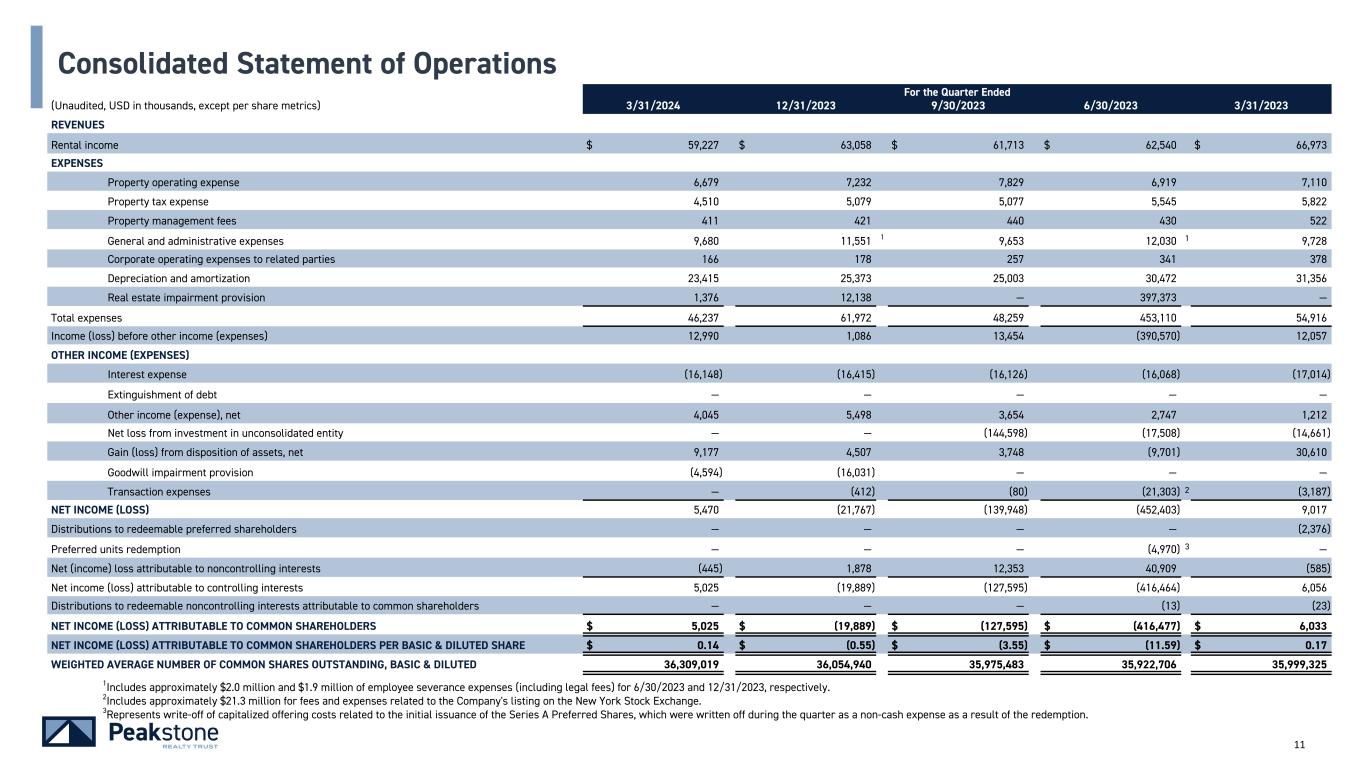 10 For the Quarter Ended (Unaudited, USD in thousands) 3/31/2024 12/31/2023 9/30/2023 6/30/2023 3/31/2023 REVENUE BY SEGMENT Industrial $ 14,833 $ 14,796 $ 13,934 $ 13,981 $ 14,594 Office 32,999 34,525 34,022 34,999 39,189 Industrial and Office Total 47,832 49,321 47,956 48,980 53,783 Other 11,395 13,737 13,757 13,560 13,190 Total Revenue $ 59,227 $ 63,058 $ 61,713 $ 62,540 $ 66,973 NOI BY SEGMENT1 Industrial $ 12,517 $ 12,651 $ 12,050 $ 12,320 $ 12,630 Office 27,514 28,748 27,920 28,923 32,852 Industrial and Office Total 40,031 41,399 39,970 41,243 45,482 Other 7,596 8,927 8,397 8,403 8,037 Total NOI $ 47,627 $ 50,326 $ 48,367 $ 49,646 $ 53,519 CASH NOI BY SEGMENT1 Industrial $ 11,817 $ 12,485 $ 11,901 $ 12,117 $ 12,394 Office 27,504 28,763 27,430 26,885 29,396 Industrial and Office Total 39,321 41,248 39,331 39,002 41,790 Other 8,009 9,274 8,598 8,564 8,226 Total Cash NOI $ 47,330 $ 50,522 $ 47,929 $ 47,566 $ 50,016 Select Financial Data (continued) 1 NOI and Cash NOI are non-GAAP financial measures. See slide 15 for reconciliations of NOI and Cash NOI for the quarters ending 3/31/2024 and 3/31/2023 and slide 61 for reconciliations of NOI and Cash NOI for the interim periods ending 12/31/2023, 9/30/2023, and 6/30/2023.