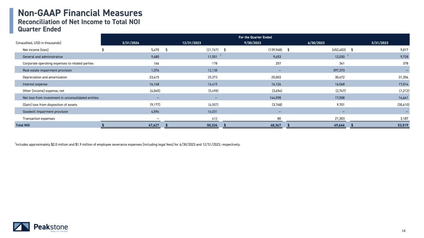 13 As of (Unaudited, USD in thousands) 3/31/2024 12/31/2023 9/30/2023 6/30/2023 3/31/2023 LIABILITIES AND EQUITY Debt, net $ 1,416,433 $ 1,435,923 $ 1,442,003 $ 1,460,536 $ 1,461,584 Distributions payable 8,422 8,344 8,296 8,295 5,164 Due to related parties 573 573 706 1,043 876 Intangible liabilities, net 15,289 16,023 17,104 17,989 19,818 Lease liability 46,932 46,281 46,368 46,368 46,320 Liabilities held for sale 159 539 — — — Accrued expenses and other liabilities 64,132 78,229 80,452 81,169 79,741 TOTAL LIABILITIES 1,551,940 1,585,912 1,594,929 1,615,400 1,613,503 Perpetual convertible preferred shares1 — — — — 125,000 Noncontrolling interests subject to redemption — — — — 3,801 SHAREHOLDERS’ EQUITY Common Shares 36 36 36 36 36 Additional paid-in capital 2,992,071 2,990,085 2,967,635 2,959,011 2,950,706 Cumulative distributions (1,084,273) (1,076,000) (1,067,807) (1,059,668) (1,051,551) Accumulated (loss) income (822,829) (827,854) (807,965) (680,369) (263,893) Accumulated other comprehensive income (loss) 25,938 25,817 37,434 40,282 33,847 TOTAL SHAREHOLDERS’ EQUITY 1,110,943 1,112,084 1,129,333 1,259,292 1,669,145 Noncontrolling interests 90,877 91,629 115,947 135,534 173,157 TOTAL EQUITY 1,201,820 1,203,713 1,245,280 1,394,826 1,842,302 TOTAL LIABILITIES AND EQUITY $ 2,753,760 $ 2,789,625 $ 2,840,209 $ 3,010,226 $ 3,584,606 Consolidated Balance Sheet (continued) 1On April 10, 2023, the Company redeemed all issued and outstanding preferred shares (5mm Series A Preferred Shares which were issued to and held by third-party international investors).