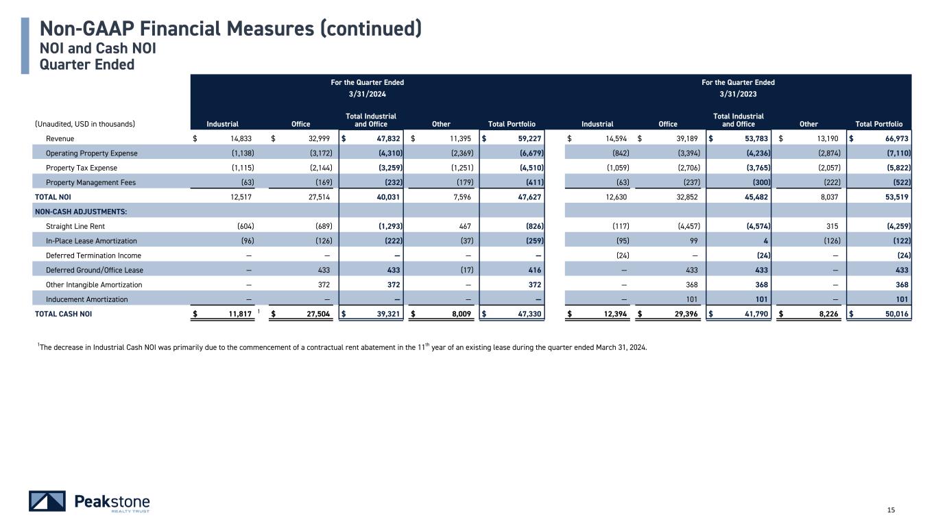14 For the Quarter Ended (Unaudited, USD in thousands) 3/31/2024 12/31/2023 9/30/2023 6/30/2023 3/31/2023 Net income (loss) $ 5,470 $ (21,767) $ (139,948) $ (452,403) $ 9,017 General and administrative 9,680 11,551 1 9,653 12,030 1 9,728 Corporate operating expenses to related parties 166 178 257 341 378 Real estate impairment provision 1,376 12,138 — 397,373 — Depreciation and amortization 23,415 25,373 25,003 30,472 31,356 Interest expense 16,148 16,415 16,126 16,068 17,014 Other (income) expense, net (4,045) (5,498) (3,654) (2,747) (1,212) Net loss from investment in unconsolidated entities — — 144,598 17,508 14,661 (Gain) loss from disposition of assets (9,177) (4,507) (3,748) 9,701 (30,610) Goodwill impairment provision 4,594 16,031 — — — Transaction expenses — 412 80 21,303 3,187 Total NOI $ 47,627 $ 50,326 $ 48,367 $ 49,646 $ 53,519 Non-GAAP Financial Measures Reconciliation of Net Income to Total NOI Quarter Ended 1Includes approximately $2.0 million and $1.9 million of employee severance expenses (including legal fees) for 6/30/2023 and 12/31/2023, respectively.