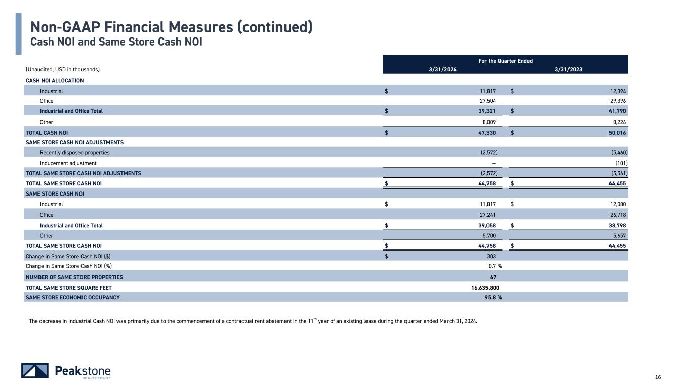 15 For the Quarter Ended For the Quarter Ended 3/31/2024 3/31/2023 (Unaudited, USD in thousands) Industrial Office Total Industrial and Office Other Total Portfolio Industrial Office Total Industrial and Office Other Total Portfolio Revenue $ 14,833 $ 32,999 $ 47,832 $ 11,395 $ 59,227 $ 14,594 $ 39,189 $ 53,783 $ 13,190 $ 66,973 Operating Property Expense (1,138) (3,172) (4,310) (2,369) (6,679) (842) (3,394) (4,236) (2,874) (7,110) Property Tax Expense (1,115) (2,144) (3,259) (1,251) (4,510) (1,059) (2,706) (3,765) (2,057) (5,822) Property Management Fees (63) (169) (232) (179) (411) (63) (237) (300) (222) (522) TOTAL NOI 12,517 27,514 40,031 7,596 47,627 12,630 32,852 45,482 8,037 53,519 NON-CASH ADJUSTMENTS: Straight Line Rent (604) (689) (1,293) 467 (826) (117) (4,457) (4,574) 315 (4,259) In-Place Lease Amortization (96) (126) (222) (37) (259) (95) 99 4 (126) (122) Deferred Termination Income — — — — — (24) — (24) — (24) Deferred Ground/Office Lease — 433 433 (17) 416 — 433 433 — 433 Other Intangible Amortization — 372 372 — 372 — 368 368 — 368 Inducement Amortization — — — — — — 101 101 — 101 TOTAL CASH NOI $ 11,817 1 $ 27,504 $ 39,321 $ 8,009 $ 47,330 $ 12,394 $ 29,396 $ 41,790 $ 8,226 $ 50,016 Non-GAAP Financial Measures (continued) NOI and Cash NOI Quarter Ended 1The decrease in Industrial Cash NOI was primarily due to the commencement of a contractual rent abatement in the 11th year of an existing lease during the quarter ended March 31, 2024.