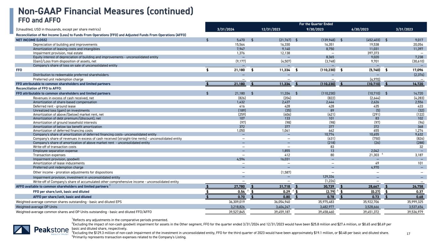 16 For the Quarter Ended (Unaudited, USD in thousands) 3/31/2024 3/31/2023 CASH NOI ALLOCATION Industrial $ 11,817 $ 12,394 Office 27,504 29,396 Industrial and Office Total $ 39,321 $ 41,790 Other 8,009 8,226 TOTAL CASH NOI $ 47,330 $ 50,016 SAME STORE CASH NOI ADJUSTMENTS Recently disposed properties (2,572) (5,460) Inducement adjustment — (101) TOTAL SAME STORE CASH NOI ADJUSTMENTS (2,572) (5,561) TOTAL SAME STORE CASH NOI $ 44,758 $ 44,455 SAME STORE CASH NOI Industrial1 $ 11,817 $ 12,080 Office 27,241 26,718 Industrial and Office Total $ 39,058 $ 38,798 Other 5,700 5,657 TOTAL SAME STORE CASH NOI $ 44,758 $ 44,455 Change in Same Store Cash NOI ($) $ 303 Change in Same Store Cash NOI (%) 0.7 % NUMBER OF SAME STORE PROPERTIES 67 TOTAL SAME STORE SQUARE FEET 16,635,800 SAME STORE ECONOMIC OCCUPANCY 95.8 % Non-GAAP Financial Measures (continued) Cash NOI and Same Store Cash NOI 1The decrease in Industrial Cash NOI was primarily due to the commencement of a contractual rent abatement in the 11th year of an existing lease during the quarter ended March 31, 2024.