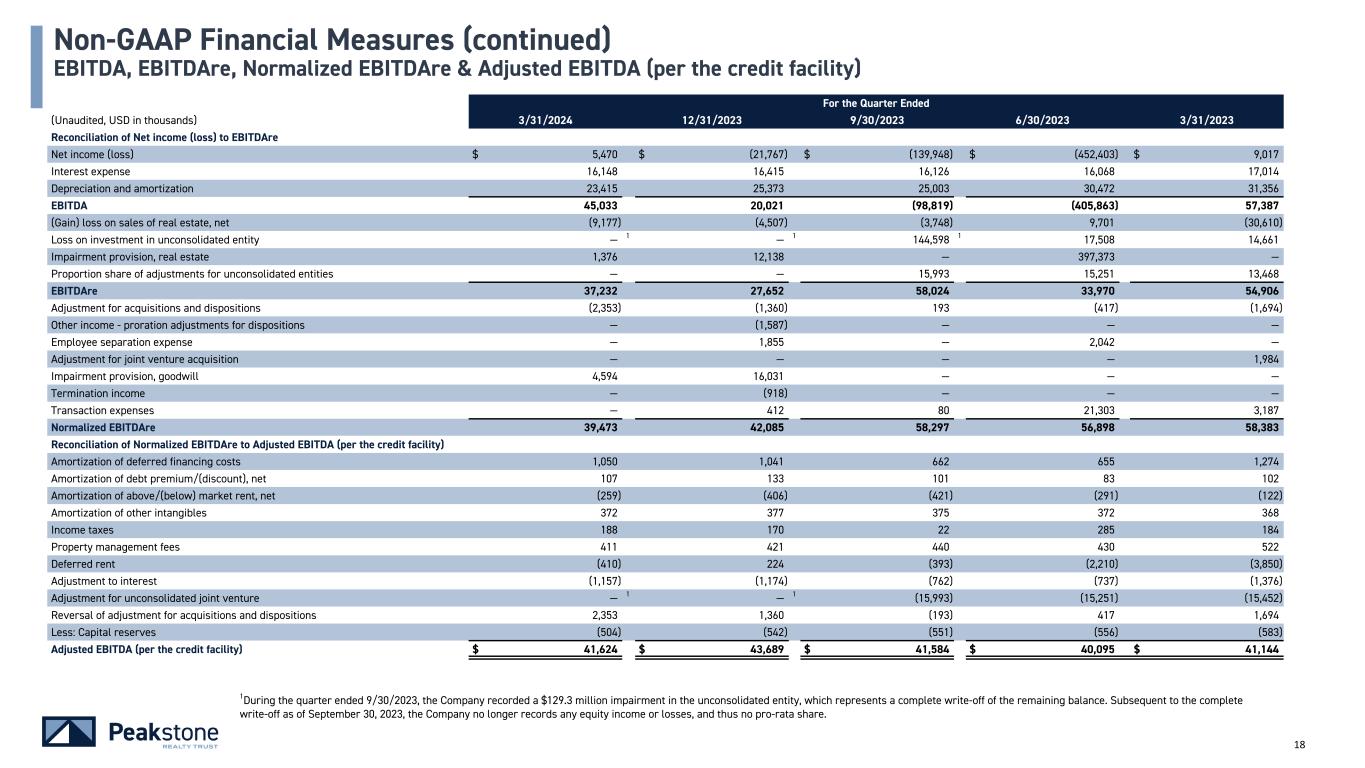 17 For the Quarter Ended (Unaudited, USD in thousands, except per share metrics) 3/31/2024 12/31/2023 9/30/2023 6/30/2023 3/31/2023 Reconciliation of Net Income (Loss) to Funds From Operations (FFO) and Adjusted Funds From Operations (AFFO) NET INCOME (LOSS) $ 5,470 $ (21,767) $ (139,948) $ (452,403) $ 9,017 Depreciation of building and improvements 15,564 16,330 16,351 19,538 20,054 Amortization of leasing costs and intangibles 7,947 9,140 8,750 11,031 11,397 Impairment provision, real estate 1,376 12,138 — 397,373 — Equity interest of depreciation of building and improvements - unconsolidated entity — — 8,365 9,020 7,238 (Gain)/Loss from disposition of assets, net (9,177) (4,507) (3,748) 9,701 (30,610) Company's share of loss on sale of unconsolidated entity — — — — — FFO $ 21,180 $ 11,334 $ (110,230) $ (5,740) $ 17,096 Distribution to redeemable preferred shareholders — — — — (2,376) Preferred unit redemption charge — — — (4,970) — FFO attributable to common shareholders and limited partners $ 21,180 $ 11,334 $ (110,230) $ (10,710) $ 14,720 Reconciliation of FFO to AFFO: FFO attributable to common shareholders and limited partners $ 21,180 $ 11,334 $ (110,230) (10,710) $ 14,720 Revenues in excess of cash received, net (826) (204) (822) (2,644) (4,283) Amortization of share-based compensation 1,432 2,437 2,444 2,626 2,556 Deferred rent - ground lease 416 428 428 435 433 Unrealized loss (gain) on investments (189) (35) 89 (5) (32) Amortization of above/(below) market rent, net (259) (406) (421) (291) (122) Amortization of debt premium/(discount), net 107 133 101 83 102 Amortization of ground leasehold interests (97) (98) (98) (97) (96) Amortization of below tax benefit amortization 372 377 377 372 368 Amortization of deferred financing costs 1,050 1,041 662 655 1,274 Company's share of amortization of deferred financing costs- unconsolidated entity — — 10,774 10,655 9,632 Company's share of revenues in excess of cash received (straight-line rents) - unconsolidated entity — — (631) (750) (826) Company's share of amortization of above market rent - unconsolidated entity — — (218) (26) (288) Write-off of transaction costs — — 83 32 Employee separation expense — 1,855 13 2,042 — Transaction expenses — 412 80 21,303 4 3,187 Impairment provision, goodwill 4,594 16,031 — — — Amortization of lease inducements — — — 49 101 Preferred unit redemption charge — — — 4,970 — Other income - proration adjustments for dispositions — (1,587) — — — Impairment provision, investment in unconsolidated entity — — 129,334 — — Write-off of Company's share of accumulated other comprehensive income - unconsolidated entity — — (1,226) — — AFFO available to common shareholders and limited partners 1 $ 27,780 $ 31,718 $ 30,739 $ 28,667 $ 26,758 FFO per share/unit, basic and diluted $ 0.54 2 $ 0.29 2 $ (2.79) 3 $ (0.27) $ 0.37 AFFO per share/unit, basic and diluted $ 0.70 $ 0.80 $ 0.78 $ 0.73 $ 0.68 Weighted-average common shares outstanding - basic and diluted EPS 36,309,019 36,054,940 35,975,483 35,922,706 35,999,325 Weighted-average OP Units 3,218,826 3,404,247 3,482,977 3,528,666 3,537,654 Weighted-average common shares and OP Units outstanding - basic and diluted FFO/AFFO 39,527,845 39,459,187 39,458,460 39,451,372 39,536,979 Non-GAAP Financial Measures (continued) FFO and AFFO 1Reflects any adjustments in the comparative periods presented. 2Excluding the impact of non-cash goodwill impairment for assets in the Other segment, FFO for the quarter ended 3/31/2024 and 12/31/2023 would have been $25.8 million and $27.4 million, or $0.65 and $0.69 per basic and diluted share, respectively. 3Excluding the $129.3 million of non-cash impairment of the investment in unconsolidated entity, FFO for the third quarter of 2023 would have been approximately $19.1 million, or $0.48 per basic and diluted share. 4Primarily represents transaction expenses related to the Company's Listing.