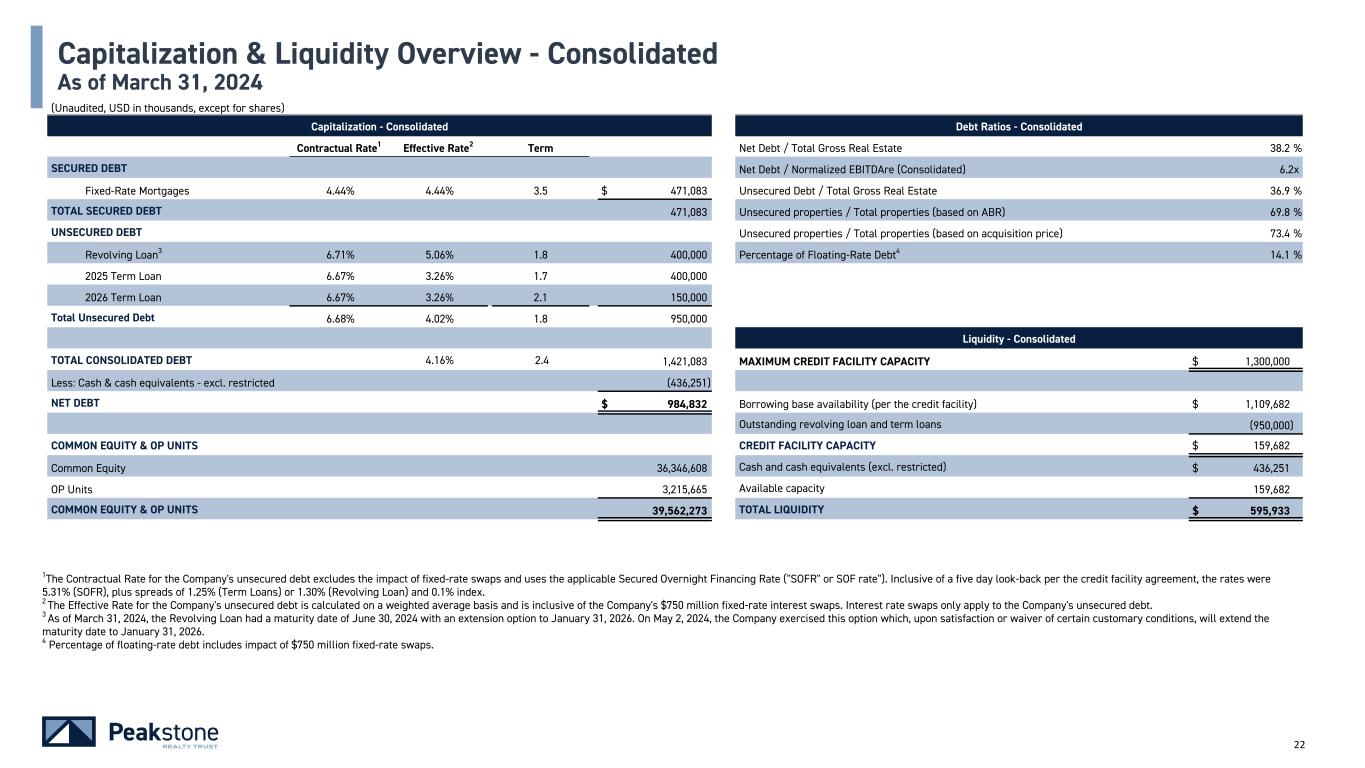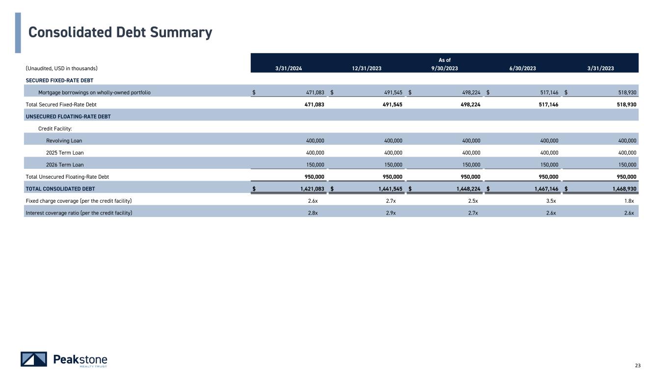 22 1The Contractual Rate for the Company's unsecured debt excludes the impact of fixed-rate swaps and uses the applicable Secured Overnight Financing Rate ("SOFR" or SOF rate"). Inclusive of a five day look-back per the credit facility agreement, the rates were 5.31% (SOFR), plus spreads of 1.25% (Term Loans) or 1.30% (Revolving Loan) and 0.1% index. 2 The Effective Rate for the Company's unsecured debt is calculated on a weighted average basis and is inclusive of the Company's $750 million fixed-rate interest swaps. Interest rate swaps only apply to the Company's unsecured debt. 3 As of March 31, 2024, the Revolving Loan had a maturity date of June 30, 2024 with an extension option to January 31, 2026. On May 2, 2024, the Company exercised this option which, upon satisfaction or waiver of certain customary conditions, will extend the maturity date to January 31, 2026. 4 Percentage of floating-rate debt includes impact of $750 million fixed-rate swaps. (Unaudited, USD in thousands, except for shares) Capitalization - Consolidated Debt Ratios - Consolidated Contractual Rate1 Effective Rate2 Term Net Debt / Total Gross Real Estate 38.2 % SECURED DEBT Net Debt / Normalized EBITDAre (Consolidated) 6.2x Fixed-Rate Mortgages 4.44% 4.44% 3.5 $ 471,083 Unsecured Debt / Total Gross Real Estate 36.9 % TOTAL SECURED DEBT 471,083 Unsecured properties / Total properties (based on ABR) 69.8 % UNSECURED DEBT Unsecured properties / Total properties (based on acquisition price) 73.4 % Revolving Loan3 6.71% 5.06% 1.8 400,000 Percentage of Floating-Rate Debt4 14.1 % 2025 Term Loan 6.67% 3.26% 1.7 400,000 2026 Term Loan 6.67% 3.26% 2.1 150,000 Total Unsecured Debt 6.68% 4.02% 1.8 950,000 Liquidity - Consolidated TOTAL CONSOLIDATED DEBT 4.16% 2.4 1,421,083 MAXIMUM CREDIT FACILITY CAPACITY $ 1,300,000 Less: Cash & cash equivalents - excl. restricted (436,251) NET DEBT $ 984,832 Borrowing base availability (per the credit facility) $ 1,109,682 Outstanding revolving loan and term loans (950,000) COMMON EQUITY & OP UNITS CREDIT FACILITY CAPACITY $ 159,682 Common Equity 36,346,608 Cash and cash equivalents (excl. restricted) $ 436,251 OP Units 3,215,665 Available capacity 159,682 COMMON EQUITY & OP UNITS 39,562,273 TOTAL LIQUIDITY $ 595,933 Capitalization & Liquidity Overview - Consolidated As of March 31, 2024