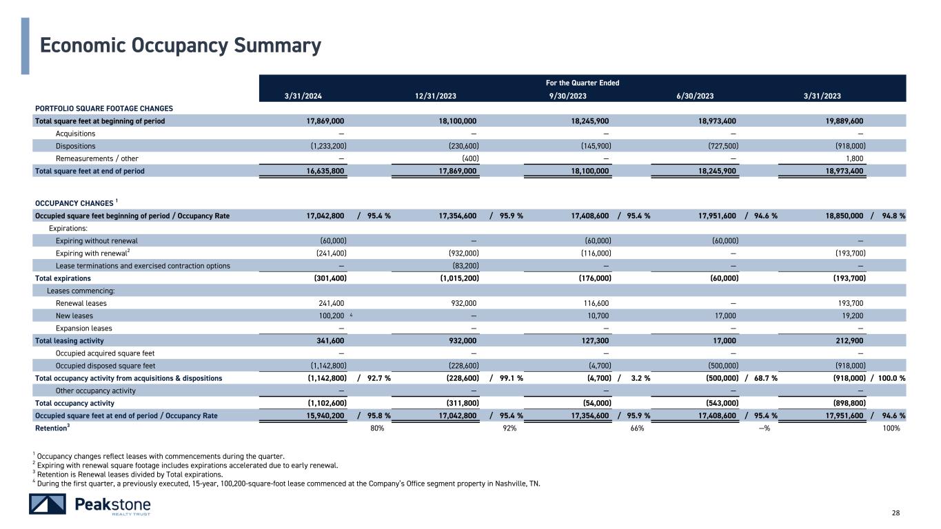 28 1 Occupancy changes reflect leases with commencements during the quarter. 2 Expiring with renewal square footage includes expirations accelerated due to early renewal. 3 Retention is Renewal leases divided by Total expirations. 4 During the first quarter, a previously executed, 15-year, 100,200-square-foot lease commenced at the Company’s Office segment property in Nashville, TN. For the Quarter Ended 3/31/2024 12/31/2023 9/30/2023 6/30/2023 3/31/2023 PORTFOLIO SQUARE FOOTAGE CHANGES Total square feet at beginning of period 17,869,000 18,100,000 18,245,900 18,973,400 19,889,600 Acquisitions — — — — — Dispositions (1,233,200) (230,600) (145,900) (727,500) (918,000) Remeasurements / other — (400) — — 1,800 Total square feet at end of period 16,635,800 17,869,000 18,100,000 18,245,900 18,973,400 OCCUPANCY CHANGES 1 Occupied square feet beginning of period / Occupancy Rate 17,042,800 / 95.4 % 17,354,600 / 95.9 % 17,408,600 / 95.4 % 17,951,600 / 94.6 % 18,850,000 / 94.8 % Expirations: Expiring without renewal (60,000) — (60,000) (60,000) — Expiring with renewal2 (241,400) (932,000) (116,000) — (193,700) Lease terminations and exercised contraction options — (83,200) — — — Total expirations (301,400) (1,015,200) (176,000) (60,000) (193,700) Leases commencing: Renewal leases 241,400 932,000 116,600 — 193,700 New leases 100,200 4 — 10,700 17,000 19,200 Expansion leases — — — — — Total leasing activity 341,600 932,000 127,300 17,000 212,900 Occupied acquired square feet — — — — — Occupied disposed square feet (1,142,800) (228,600) (4,700) (500,000) (918,000) Total occupancy activity from acquisitions & dispositions (1,142,800) / 92.7 % (228,600) / 99.1 % (4,700) / 3.2 % (500,000) / 68.7 % (918,000) / 100.0 % Other occupancy activity — — — — — Total occupancy activity (1,102,600) (311,800) (54,000) (543,000) (898,800) Occupied square feet at end of period / Occupancy Rate 15,940,200 / 95.8 % 17,042,800 / 95.4 % 17,354,600 / 95.9 % 17,408,600 / 95.4 % 17,951,600 / 94.6 % Retention3 80% 92% 66% —% 100% Economic Occupancy Summary