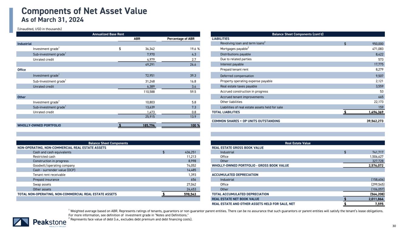 30 (Unaudited, USD in thousands) Annualized Base Rent Balance Sheet Components (cont'd) ABR Percentage of ABR LIABILITIES Industrial Revolving loan and term loans2 $ 950,000 Investment grade1 $ 36,342 19.6 % Mortgages payable2 471,083 Sub-investment grade1 7,970 4.3 Distributions payable 8,422 Unrated credit 4,979 2.7 Due to related parties 573 49,291 26.6 Interest payable 17,775 Office Prepaid tenant rent 8,279 Investment grade1 72,951 39.3 Deferred compensation 9,507 Sub-Investment grade1 31,248 16.8 Property operating expense payable 2,121 Unrated credit 6,389 3.4 Real estate taxes payable 3,559 110,588 59.5 Accrued construction in progress 53 Other Accrued tenant improvements 665 Investment grade1 10,803 5.8 Other liabilities 22,173 Sub-investment grade1 13,639 7.3 Liabilities of real estate assets held for sale 159 Unrated credit 1,473 0.8 TOTAL LIABILITIES $ 1,494,369 25,915 13.9 COMMON SHARES + OP UNITS OUTSTANDING 39,562,273 WHOLLY-OWNED PORTFOLIO $ 185,794 100 % Balance Sheet Components Real Estate Value NON-OPERATING, NON-COMMERCIAL REAL ESTATE ASSETS REAL ESTATE GROSS BOOK VALUE Cash and cash equivalents $ 436,251 Industrial $ 741,717 Restricted cash 11,213 Office 1,506,627 Construction in progress 8,998 Other 327,728 Goodwill/operating company 74,052 WHOLLY-OWNED PORTFOLIO - GROSS BOOK VALUE 2,576,072 Cash - surrender value (DCP) 14,485 Tenant rent receivable 1,393 ACCUMULATED DEPRECIATION Prepaid insurance 656 Industrial (158,606) Swap assets 27,042 Office (299,545) Other assets 24,453 Other (106,057) TOTAL NON-OPERATING, NON-COMMERCIAL REAL ESTATE ASSETS $ 598,543 TOTAL ACCUMULATED DEPRECIATION (564,208) REAL ESTATE NET BOOK VALUE $ 2,011,864 REAL ESTATE AND OTHER ASSETS HELD FOR SALE, NET $ 7,595 Components of Net Asset Value As of March 31, 2024 1 Weighted average based on ABR. Represents ratings of tenants, guarantors or non guarantor parent entities. There can be no assurance that such guarantors or parent entities will satisfy the tenant’s lease obligations. For more information, see definition of investment grade in "Notes and Definitions." 2 Represents face value of debt (i.e., excludes debt premium and debt financing costs).