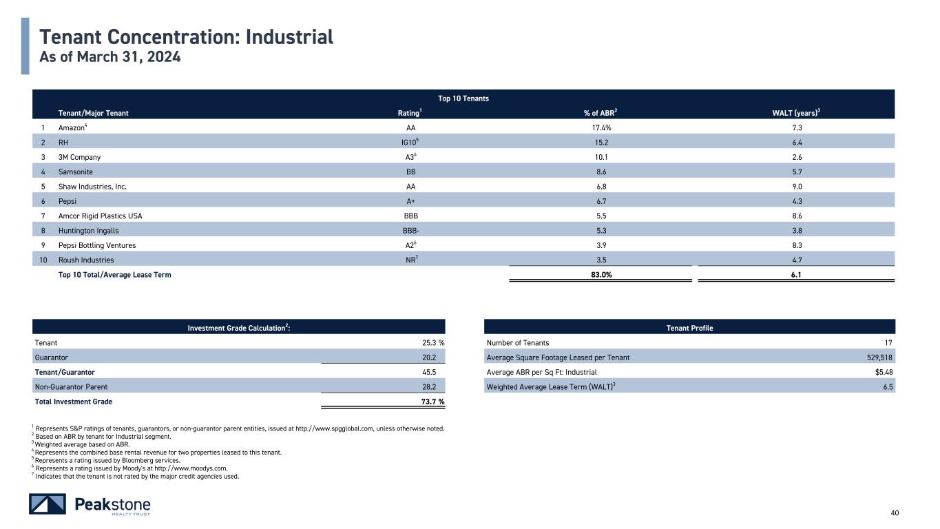 39 Top 10 Tenants Tenant/Major Tenant Rating1 % of ABR2 WALT (years)3 1 Keurig Dr. Pepper Baa14 7.2% 5.6 2 Southern Company BBB+ 5.9 20.0 3 LPL BBB- 5.4 12.6 4 Amazon5 AA 5.4 7.3 5 Freeport McMoRan Baa14 4.9 3.1 6 Maxar Technologies HY56 4.8 6.3 7 RH IG106 4.7 6.4 8 McKesson A36 3.9 4.5 9 Travel & Leisure, Co. BB- 3.6 5.4 10 IGT BB+ 3.3 6.8 Top 10 Total/Average Lease Term 49.1% 8.2 Investment Grade Calculation2: Tenant Profile Tenant 39.4 % Number of Tenants 46 Guarantor 8.8 Average Square Footage Leased per Tenant 311,989 Tenant/Guarantor 48.2 Average ABR per Sq Ft: Industrial and Office $11.09 Non-Guarantor Parent 20.2 Weighted Average Lease Term (WALT)3 7.3 Total Investment Grade 68.4 % Tenant Concentration: Industrial and Office As of March 31, 2024 1 Represents S&P ratings of tenants, guarantors, or non-guarantor parent entities, issued at http://www.spgglobal.com, unless otherwise noted. 2 Based on ABR by tenant for Industrial and Office segments. 3 Weighted average based on ABR. 4 Represents a rating issued by Moody's at http://www.moodys.com. 5 Represents the combined base rental revenue for two properties leased to this tenant. 6 Represents a rating issued by Bloomberg services.