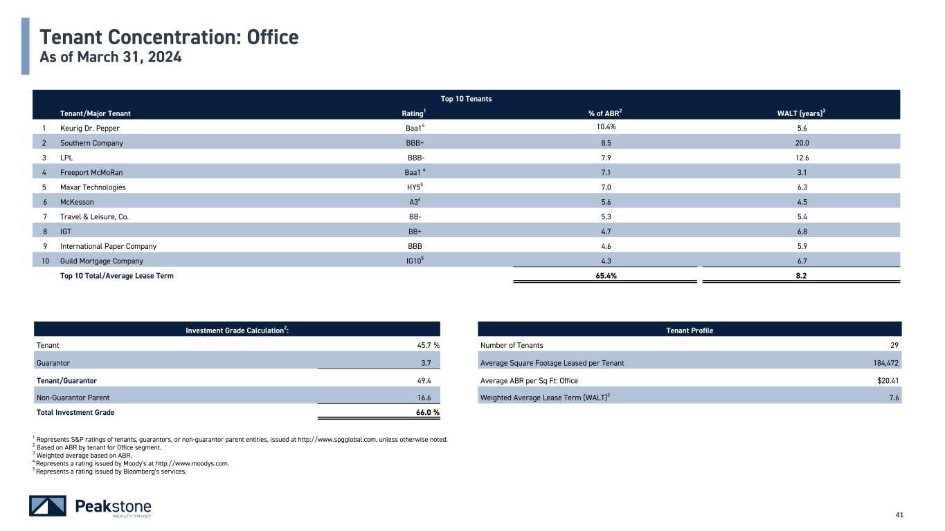 40 Top 10 Tenants Tenant/Major Tenant Rating1 % of ABR2 WALT (years)3 1 Amazon4 AA 17.4% 7.3 2 RH IG105 15.2 6.4 3 3M Company A36 10.1 2.6 4 Samsonite BB 8.6 5.7 5 Shaw Industries, Inc. AA 6.8 9.0 6 Pepsi A+ 6.7 4.3 7 Amcor Rigid Plastics USA BBB 5.5 8.6 8 Huntington Ingalls BBB- 5.3 3.8 9 Pepsi Bottling Ventures A26 3.9 8.3 10 Roush Industries NR7 3.5 4.7 Top 10 Total/Average Lease Term 83.0% 6.1 Investment Grade Calculation2: Tenant Profile Tenant 25.3 % Number of Tenants 17 Guarantor 20.2 Average Square Footage Leased per Tenant 529,518 Tenant/Guarantor 45.5 Average ABR per Sq Ft: Industrial $5.48 Non-Guarantor Parent 28.2 Weighted Average Lease Term (WALT)3 6.5 Total Investment Grade 73.7 % Tenant Concentration: Industrial As of March 31, 2024 1 Represents S&P ratings of tenants, guarantors, or non-guarantor parent entities, issued at http://www.spgglobal.com, unless otherwise noted. 2 Based on ABR by tenant for Industrial segment. 3 Weighted average based on ABR. 4 Represents the combined base rental revenue for two properties leased to this tenant. 5 Represents a rating issued by Bloomberg services. 6 Represents a rating issued by Moody's at http://www.moodys.com. 7 Indicates that the tenant is not rated by the major credit agencies used.