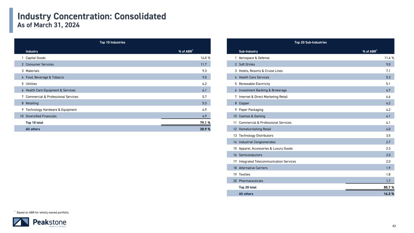 41 Top 10 Tenants Tenant/Major Tenant Rating1 % of ABR2 WALT (years)3 1 Keurig Dr. Pepper Baa14 10.4% 5.6 2 Southern Company BBB+ 8.5 20.0 3 LPL BBB- 7.9 12.6 4 Freeport McMoRan Baa1 4 7.1 3.1 5 Maxar Technologies HY55 7.0 6.3 6 McKesson A34 5.6 4.5 7 Travel & Leisure, Co. BB- 5.3 5.4 8 IGT BB+ 4.7 6.8 9 International Paper Company BBB 4.6 5.9 10 Guild Mortgage Company IG105 4.3 6.7 Top 10 Total/Average Lease Term 65.4% 8.2 Investment Grade Calculation2: Tenant Profile Tenant 45.7 % Number of Tenants 29 Guarantor 3.7 Average Square Footage Leased per Tenant 184,472 Tenant/Guarantor 49.4 Average ABR per Sq Ft: Office $20.41 Non-Guarantor Parent 16.6 Weighted Average Lease Term (WALT)3 7.6 Total Investment Grade 66.0 % Tenant Concentration: Office As of March 31, 2024 1 Represents S&P ratings of tenants, guarantors, or non-guarantor parent entities, issued at http://www.spgglobal.com, unless otherwise noted. 2 Based on ABR by tenant for Office segment. 3 Weighted average based on ABR. 4 Represents a rating issued by Moody's at http://www.moodys.com. 5 Represents a rating issued by Bloomberg's services.