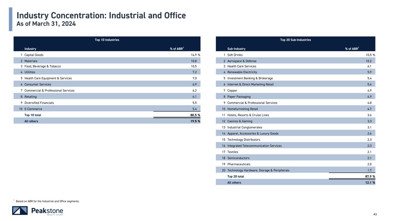 42 Industry Concentration: Consolidated As of March 31, 2024 Top 10 Industries Top 20 Sub-Industries Industry % of ABR1 Sub-Industry % of ABR1 1 Capital Goods 16.0 % 1 Aerospace & Defense 11.4 % 2 Consumer Services 11.7 2 Soft Drinks 9.0 3 Materials 9.3 3 Hotels, Resorts & Cruise Lines 7.1 4 Food, Beverage & Tobacco 9.0 4 Health Care Services 5.3 5 Utilities 6.2 5 Renewable Electricity 5.1 6 Health Care Equipment & Services 6.1 6 Investment Banking & Brokerage 4.7 7 Commercial & Professional Services 5.7 7 Internet & Direct Marketing Retail 4.6 8 Retailing 5.3 8 Copper 4.2 9 Technology Hardware & Equipment 4.9 9 Paper Packaging 4.2 10 Diversified Financials 4.9 10 Casinos & Gaming 4.1 Top 10 total 79.1 % 11 Commercial & Professional Services 4.1 All others 20.9 % 12 Homefurnishing Retail 4.0 13 Technology Distributors 3.5 14 Industrial Conglomerates 2.7 15 Apparel, Accessories & Luxury Goods 2.3 16 Semiconductors 2.0 17 Integrated Telecommunication Services 2.0 18 Alternative Carriers 1.9 19 Textiles 1.8 20 Pharmaceuticals 1.7 Top 20 total 85.7 % All others 14.3 % 1 Based on ABR for wholly-owned portfolio.