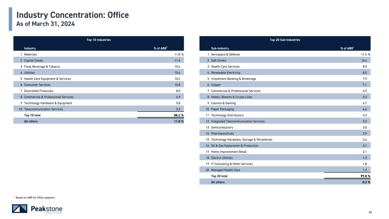 44 Industry Concentration: Industrial As of March 31, 20242021 Top 8 Industries Top 14 Sub-Industries Industry % of ABR1 Sub-Industry % of ABR1 1 Capital Goods 22.9 % 1 Internet & Direct Marketing Retail 17.4 % 2 E-Commerce 17.4 2 Homefurnishing Retail 15.2 3 Consumer Durables & Apparel 15.3 3 Soft Drinks 10.6 4 Retailing 15.2 4 Industrial Conglomerates 10.1 5 Food, Beverage & Tobacco 10.6 5 Apparel, Accessories & Luxury Goods 8.6 6 Materials 8.5 6 Aerospace & Defense 7.6 7 Automobiles & Components 5.5 7 Textiles 6.8 8 Commercial & Professional Services 4.6 8 Paper Packaging 5.5 Top 8 total 100.0 % 9 Diversified Support Services 4.6 All others — % 10 Auto Components 3.5 11 Metal & Glass Containers 3.0 12 Industrial Machinery 2.8 13 Construction Machinery & Heavy Trucks 2.3 14 Auto Parts & Equipment 2.0 Top 14 total 100.0 % All others — % 1 Based on ABR for Industrial segment.