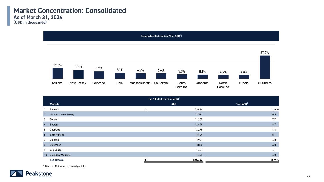45 Industry Concentration: Office As of March 31, 2024 2021 Top 10 Industries Top 20 Sub-Industries Industry % of ABR1 Sub-Industry % of ABR1 1 Materials 11.8 % 1 Aerospace & Defense 11.4 % 2 Capital Goods 11.4 2 Soft Drinks 10.4 3 Food, Beverage & Tobacco 10.4 3 Health Care Services 8.9 4 Utilities 10.4 4 Renewable Electricity 8.5 5 Health Care Equipment & Services 10.2 5 Investment Banking & Brokerage 7.9 6 Consumer Services 10.0 6 Copper 7.1 7 Diversified Financials 8.0 7 Commercial & Professional Services 6.9 8 Commercial & Professional Services 6.9 8 Hotels, Resorts & Cruise Lines 5.3 9 Technology Hardware & Equipment 5.8 9 Casinos & Gaming 4.7 10 Telecommunication Services 3.3 10 Paper Packaging 4.6 Top 10 total 88.2 % 11 Technology Distributors 3.3 All others 11.8 % 12 Integrated Telecommunication Services 3.3 13 Semiconductors 3.0 14 Pharmaceuticals 2.9 15 Technology Hardware, Storage & Peripherals 2.4 16 Oil & Gas Exploration & Production 2.1 17 Home Improvement Retail 2.1 18 Electric Utilities 1.9 19 IT Consulting & Other Services 1.8 20 Managed Health Care 1.3 Top 20 total 99.8 % All others 0.2 % 1 Based on ABR for Office segment.