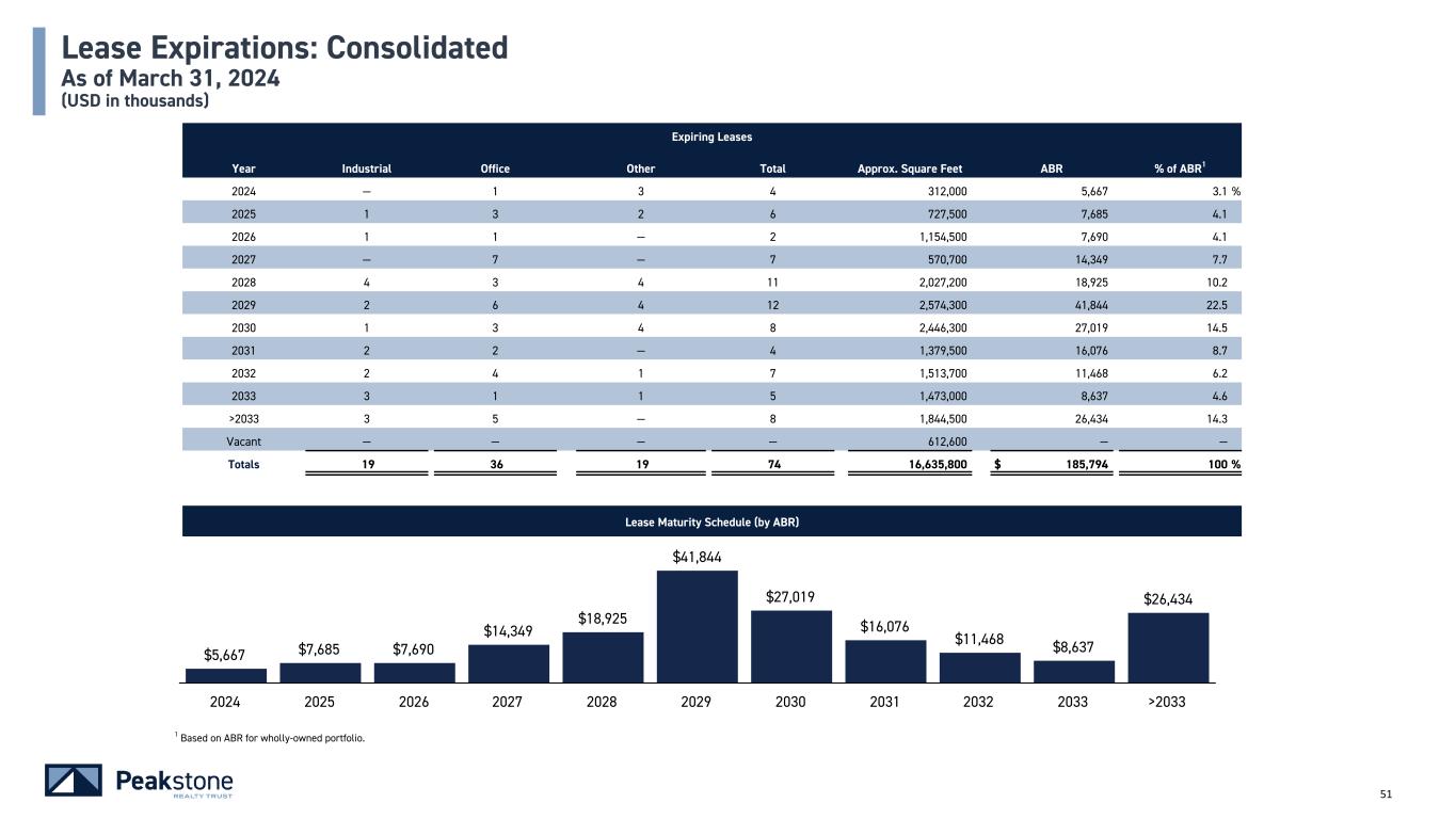50 Geographic Distribution (% of ABR1) Market Concentrations: Other As of March 31, 2024 (USD in thousands) Top 10 Markets (% of ABR)1 Markets ABR % of ABR1 1 Northern New Jersey $ 9,464 36.5 % 2 Charlotte 3,574 13.8 3 Denver 3,455 13.3 4 Phoenix 3,304 12.7 5 Las Vegas 2,490 9.6 6 Cincinnati/Dayton 1,665 6.4 7 Columbus 1,195 4.6 8 Harrisburg 768 3.1 Top 8 total $ 25,915 100.0 % 36.5% 13.8% 13.3% 12.7% 11.0% 9.6% 3.1% New Jersey North Carolina Colorado Arizona Ohio Nevada Pennsylvania 1 Based on ABR for Other segment.
