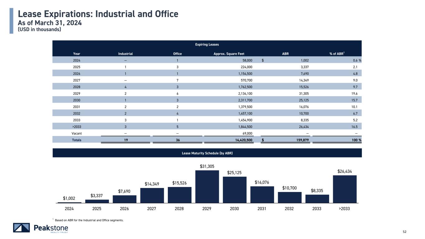51 Lease Expirations: Consolidated As of March 31, 2024 (USD in thousands) Lease Maturity Schedule (by ABR) 1 Based on ABR for wholly-owned portfolio. $5,667 $7,685 $7,690 $14,349 $18,925 $41,844 $27,019 $16,076 $11,468 $8,637 $26,434 2024 2025 2026 2027 2028 2029 2030 2031 2032 2033 >2033 Expiring Leases Year Industrial Office Other Total Approx. Square Feet ABR % of ABR1 2024 — 1 3 4 312,000 5,667 3.1 % 2025 1 3 2 6 727,500 7,685 4.1 2026 1 1 — 2 1,154,500 7,690 4.1 2027 — 7 — 7 570,700 14,349 7.7 2028 4 3 4 11 2,027,200 18,925 10.2 2029 2 6 4 12 2,574,300 41,844 22.5 2030 1 3 4 8 2,446,300 27,019 14.5 2031 2 2 — 4 1,379,500 16,076 8.7 2032 2 4 1 7 1,513,700 11,468 6.2 2033 3 1 1 5 1,473,000 8,637 4.6 >2033 3 5 — 8 1,844,500 26,434 14.3 Vacant — — — — 612,600 — — Totals 19 36 19 74 16,635,800 $ 185,794 100 %
