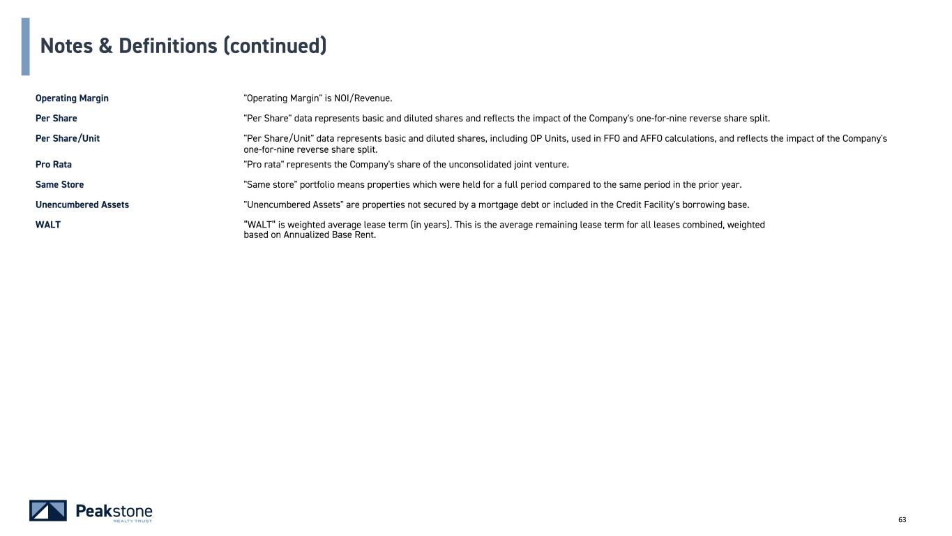 62 Notes & Definitions Normalized EBITDAre “Normalized EBITDAre” is a non-GAAP supplemental performance measure to evaluate the operating performance of the Company. Normalized EBITDAre, as defined by the Company, represents EBITDAre(as defined by NAREIT), modified to exclude items such as acquisition-related expenses, employee separation expenses and other items that we believe are not indicative of the performance of our portfolio. Normalized EBITDAre also excludes the Normalized EBITDAre impact of properties sold during the period and extrapolate the operations of acquired properties to estimate a full quarter of ownership (in each case, as if such disposition or acquisition had occurred on the first day of the quarter). We may also exclude the annualizing of other large transaction items such as termination income recognized during the quarter. Management believes these adjustments to reconcile to Normalized EBITDAre provides investors with supplemental performance information that is consistent with the performance models and analysis used by management and provides investors a view of the performance of our portfolio over time. However, because Normalized EBITDAre is calculated before recurring cash charges, including interest expense and income taxes, and is not adjusted for capital expenditures or other recurring cash requirements of our business, its utility as a measure of our liquidity is limited. Therefore, Normalized EBITDAre should not be considered as an alternative to net income, as computed in accordance with GAAP. Normalized EBITDAre may not be comparable to similarly titled measures of other companies. Normalized EBITDAre (Consolidated) "Normalized EBITDAre (Consolidated)" represents Normalized EBITDAre adjusted to exclude items related to any unconsolidated entities. We calculated Normalized EBITDAre (Consolidated) as follows: Management believes these adjustments to reconcile to Normalized EBITDAre (Consolidated) provides investors a view of the performance of our consolidated portfolio over time. However, because Normalized EBITDAre (Consolidated) is calculated before recurring cash charges, including interest expense and income taxes, and is not adjusted for capital expenditures or other recurring cash requirements of our business, its utility as a measure of our liquidity is limited. Therefore, Normalized EBITDAre (Consolidated) should not be considered as an alternative to net income, as computed in accordance with GAAP. Normalized EBITDAre(Consolidated) may not be comparable to similarly titled measures of other companies. For the Quarter Ended (Unaudited, USD in thousands) 3/31/2024 12/31/2023 9/30/2023 6/30/2023 3/31/2023 Normalized EBITDAre $ 39,473 $ 42,085 $ 58,297 $ 56,898 $ 58,383 Adjustment for unconsolidated joint venture — — (15,993) (15,251) (15,452) Normalized EBITDAre (Consolidated) $ 39,473 $ 42,085 $ 42,304 $ 41,647 $ 42,931
