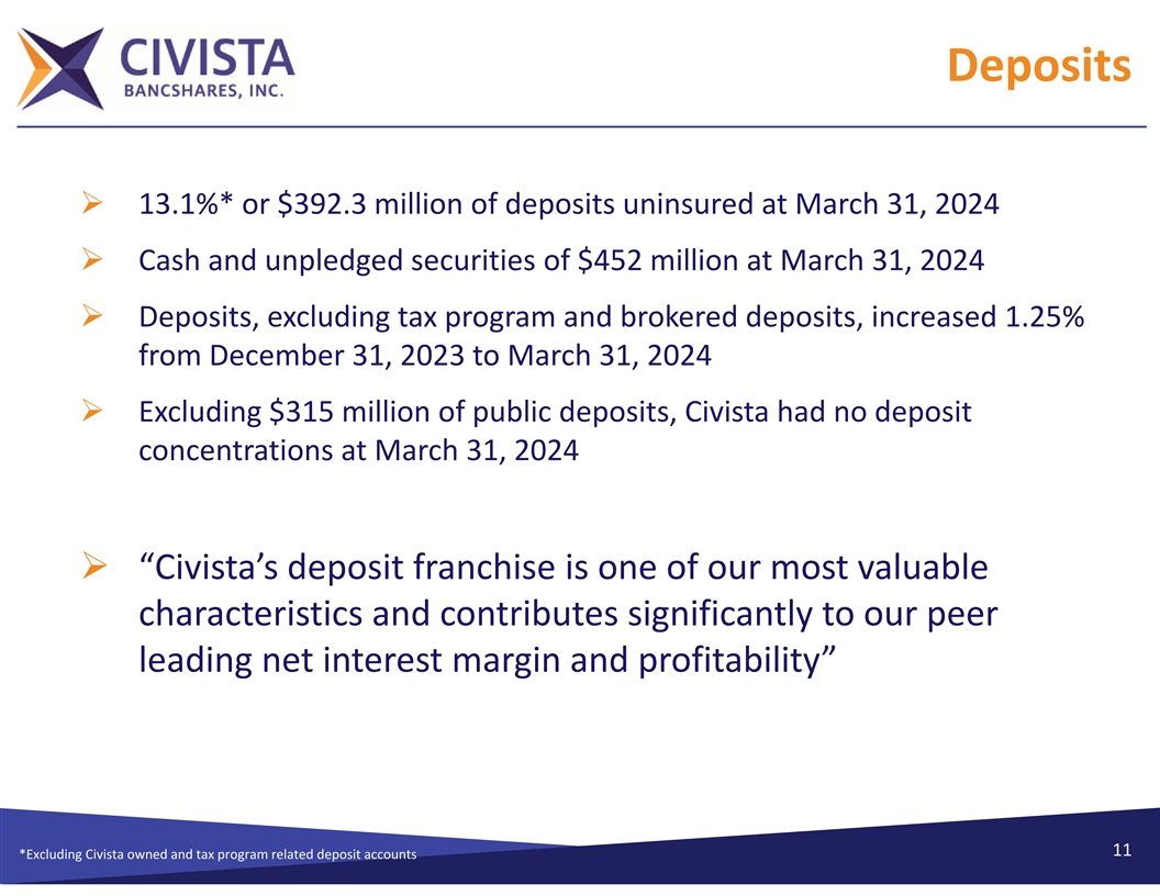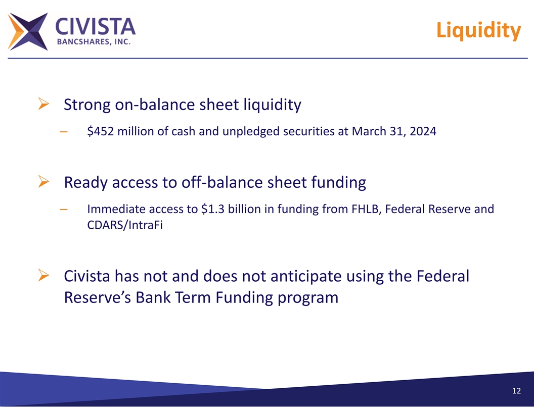 Deposits Ø 13.1%* or $392.3 million of deposits uninsured at March 31, 2024 Ø Cash and unpledged securities of $452 million at March 31, 2024 Ø Deposits, excluding tax program and brokered deposits, increased 1.25% from December 31, 2023 to March 31, 2024 Ø Excluding $315 million of public deposits, Civista had no deposit concentrations at March 31, 2024 Ø “Civista’s deposit franchise is one of our most valuable characteristics and contributes significantly to our peer leading net interest margin and profitability” 11 *Excluding Civista owned and tax program related deposit accounts