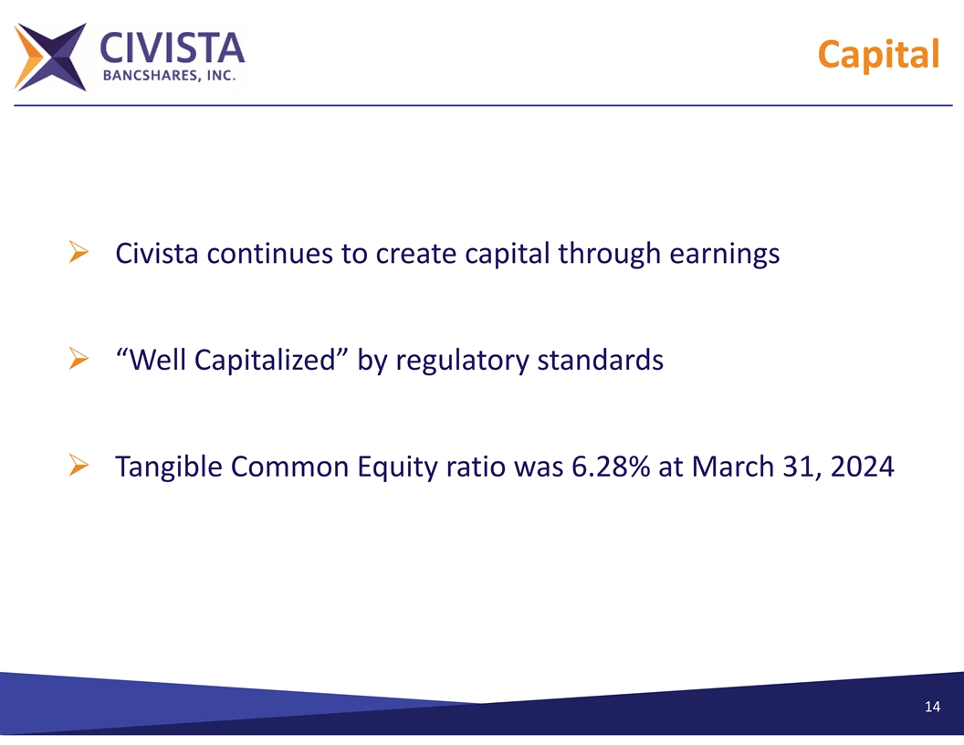 Credit Ø Adopted CECL January 1, 2023 – $4.3 million increase in Allowance for Credit Losses – $3.4 million increase in Reserve for Unfunded Commitments Ø Credit metrics remain stable and strong – ACL to nonperforming loans was 247.06% at March 31, 2024 – ACL to loans was 1.34% at March 31, 2024 13