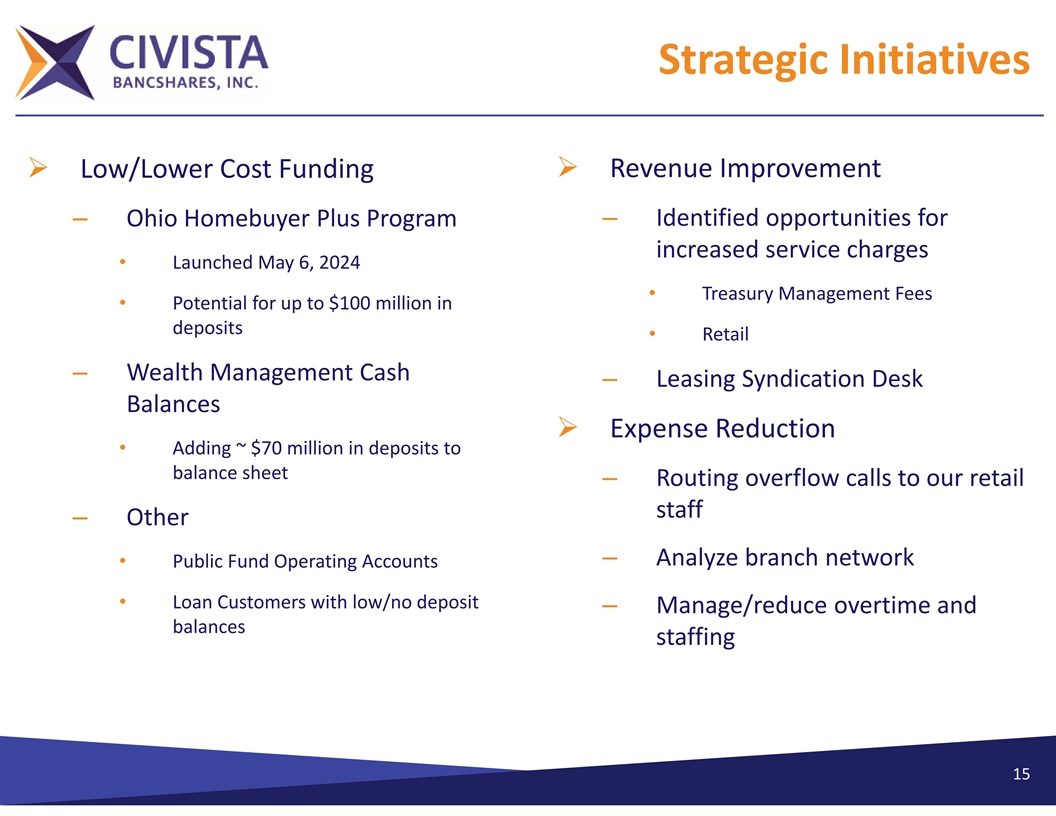 Strategic Initiatives Ø Revenue Improvement Ø Low/Lower Cost Funding – Ohio Homebuyer Plus Program – Identified opportunities for increased service charges • Launched May 6, 2024 • Treasury Management Fees • Potential for up to $100 million in deposits • Retail – Wealth Management Cash – Leasing Syndication Desk Balances Ø Expense Reduction • Adding ~ $70 million in deposits to balance sheet – Routing overflow calls to our retail staff – Other – Analyze branch network • Public Fund Operating Accounts • Loan Customers with low/no deposit – Manage/reduce overtime and balances staffing 15