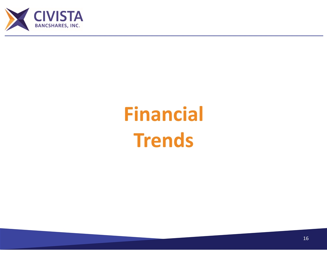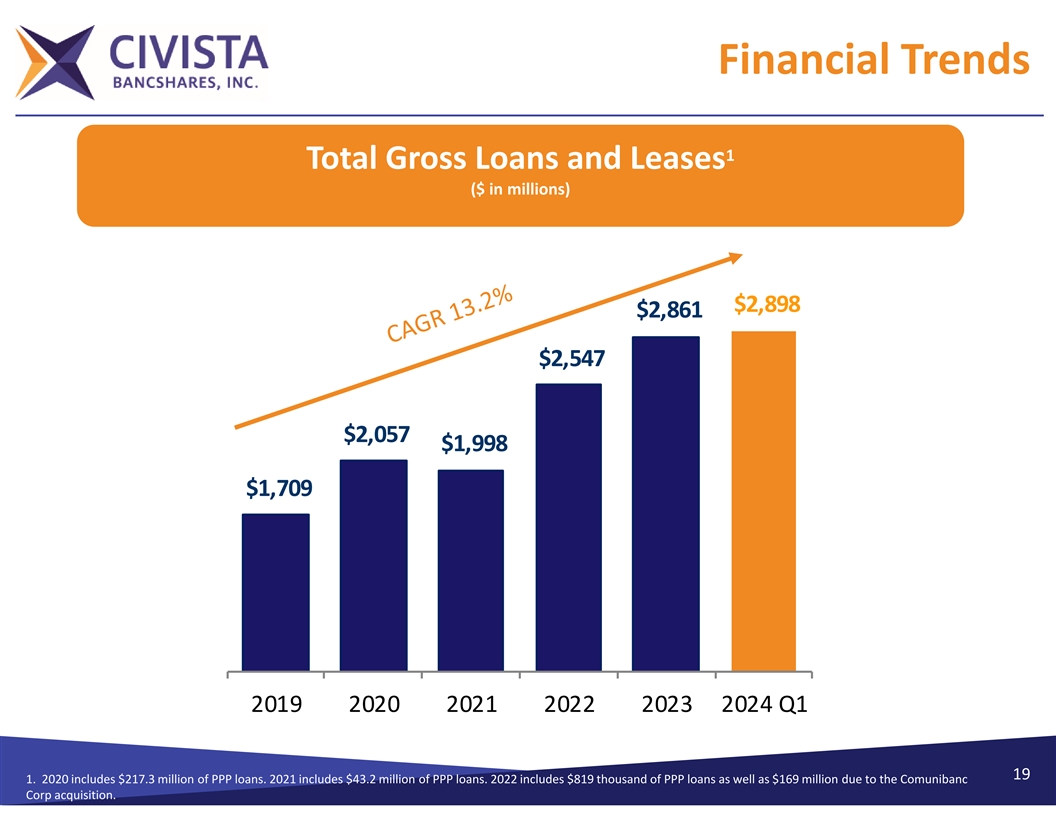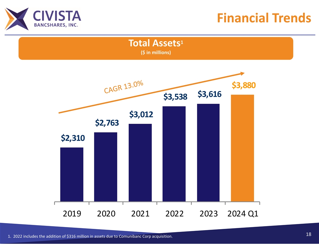 Financial Trends 1 Total Assets ($ in millions) $3,880 $3,616 $3,538 $3,012 $2,763 $2,310 2019 2020 2021 2022 2023 2024 Q1 18 1. 2022 includes the addition of $316 million in assets due to Comunibanc Corp acquisition.