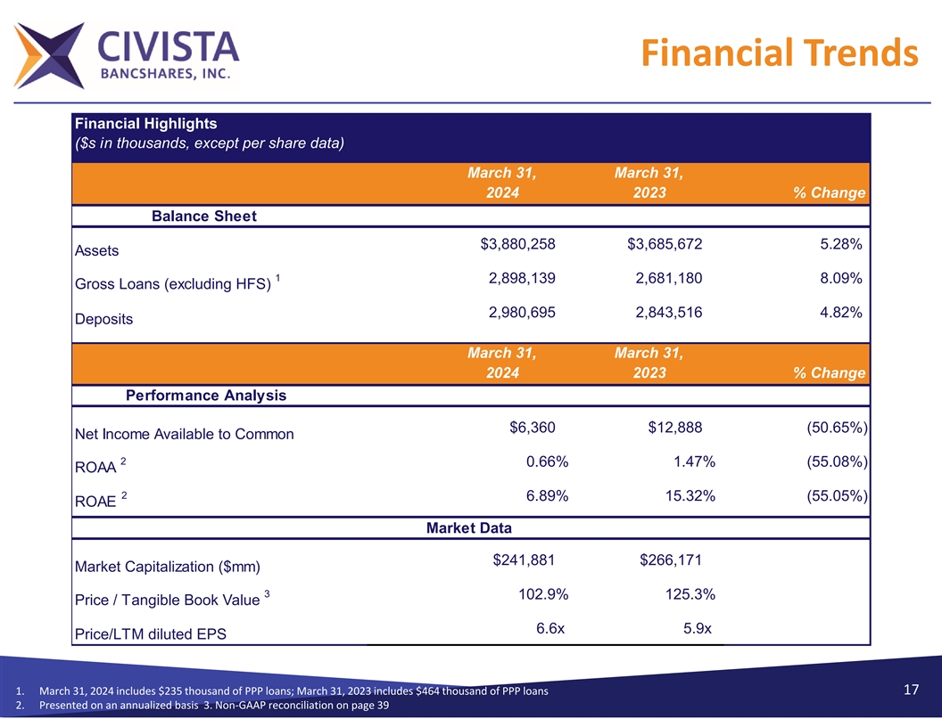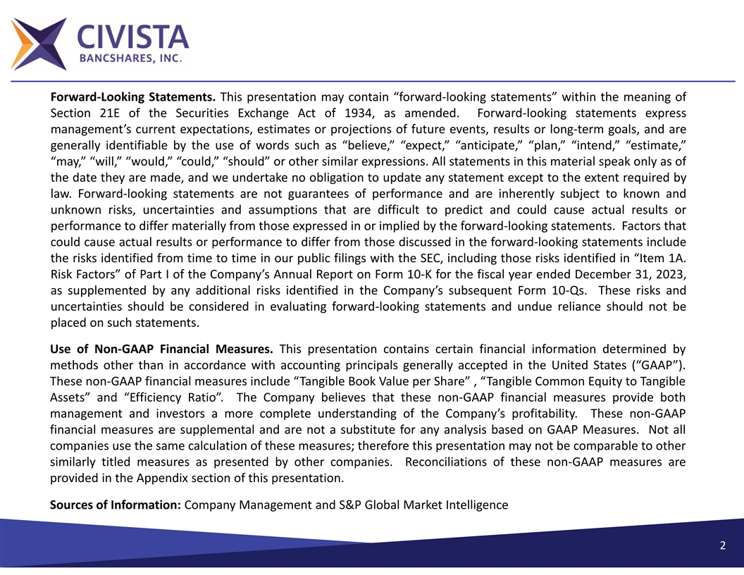 Forward‐Looking Statements. This presentation may contain “forward‐looking statements” within the meaning of Section 21E of the Securities Exchange Act of 1934, as amended. Forward‐looking statements express management’s current expectations, estimates or projections of future events, results or long‐term goals, and are generally identifiable by the use of words such as “believe,” “expect,” “anticipate,” “plan,” “intend,” “estimate,” “may,”“will,”“would,”“could,”“should”orothersimilarexpressions.Allstatementsinthismaterialspeakonlyasof the date they are made, and we undertake no obligation to update any statement except to the extent required by law. Forward‐looking statements are not guarantees of performance and are inherently subject to known and unknown risks, uncertainties and assumptions that are difficult to predict and could cause actual results or performancetodiffermateriallyfromthoseexpressedinorimpliedbytheforward‐lookingstatements. Factorsthat could cause actual results or performance to differ from those discussed in the forward‐looking statements include the risks identified from time to time in our public filings with the SEC, including those risks identified in “Item 1A. Risk Factors” of Part I of the Company’s Annual Report on Form 10‐K for the fiscal year ended December 31, 2023, as supplemented by any additional risks identified in the Company’s subsequent Form 10‐Qs. These risks and uncertainties should be considered in evaluating forward‐looking statements and undue reliance should not be placed onsuchstatements. Use of Non‐GAAP Financial Measures. This presentation contains certain financial information determined by methods other than in accordance with accounting principals generally accepted in the United States (“GAAP”). Thesenon‐GAAPfinancialmeasuresinclude“TangibleBookValueperShare”,“TangibleCommonEquitytoTangible Assets” and “Efficiency Ratio”. TheCompanybelievesthatthesenon‐GAAP financial measures provide both management and investors a more complete understanding of the Company’s profitability. These non‐GAAP financial measures are supplemental and are not a substitute for any analysis based on GAAP Measures. Not all companiesusethesamecalculationofthesemeasures;thereforethispresentationmaynotbecomparabletoother similarly titled measures as presented by other companies. Reconciliations of these non‐GAAP measures are provided intheAppendix sectionofthispresentation. SourcesofInformation: CompanyManagement andS&PGlobal MarketIntelligence 2