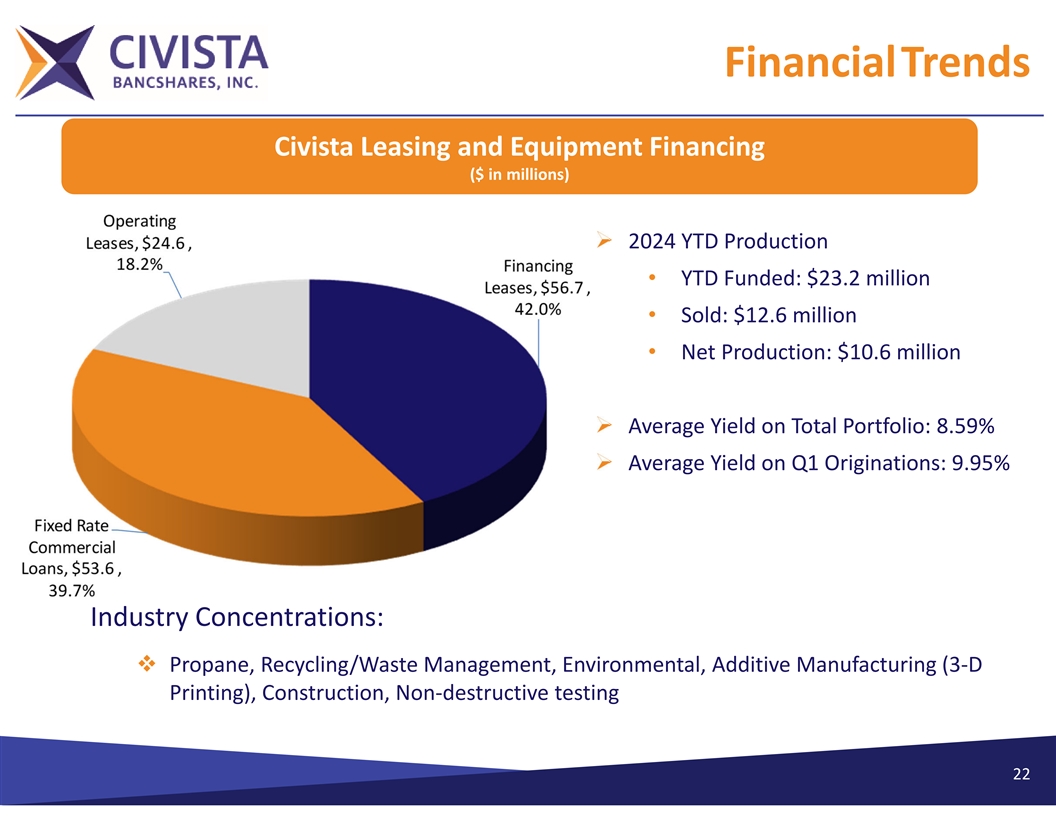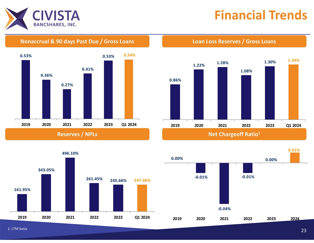 FinancialTrends Civista Leasing and Equipment Financing ($ in millions) Ø 2024 YTD Production • YTD Funded: $23.2 million • Sold: $12.6 million • Net Production: $10.6 million Ø Average Yield on Total Portfolio: 8.59% Ø Average Yield on Q1 Originations: 9.95% Industry Concentrations: v Propane, Recycling/Waste Management, Environmental, Additive Manufacturing (3‐D Printing), Construction, Non‐destructive testing 22