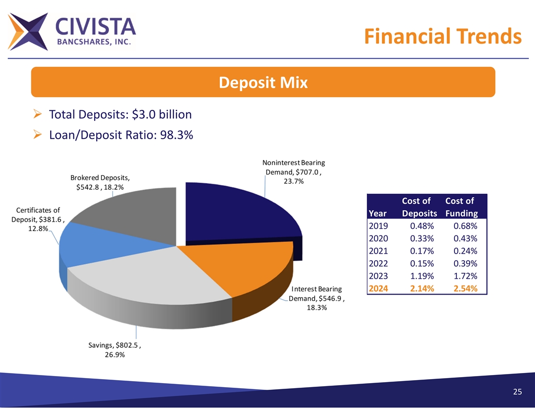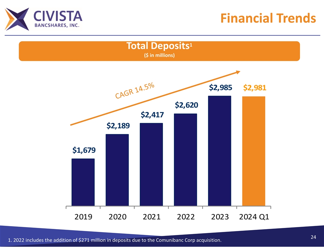 Financial Trends 1 Total Deposits ($ in millions) $2,985 $2,981 $2,620 $2,417 $2,189 $1,679 2019 2020 2021 2022 2023 2024 Q1 24 1. 2022 includes the addition of $271 million in deposits due to the Comunibanc Corp acquisition.