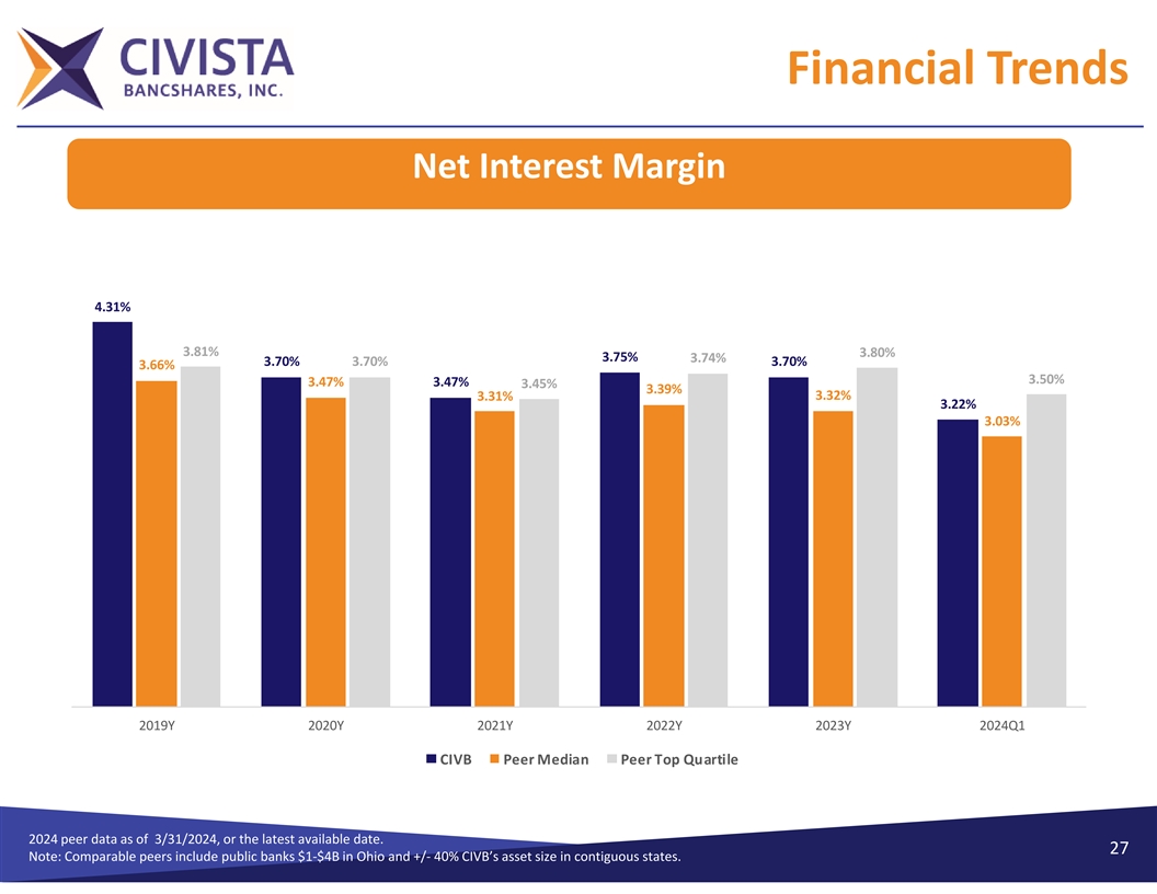Financial Trends Ø Total Cost of Deposits (%) 2.14% 2.00% 1.79% 1.64% 1.34% 1.10% 0.93% 0.93% 0.71% 0.71% 0.48% 0.33% 0.29% 0.27% 0.22% 0.22% 0.21% 0.17% 2019Y 2020Y 2021Y 2022Y 2023Y 2024Q1 CIVB Peer Median Peer Top Quartile Yield on Loans (%) 6.25% 6.20% 5.90% 5.86% 5.50% 5.42% 5.42% 5.27% 5.27% 5.09% 5.09% 4.91% 4.79% 4.69% 4.65% 4.61% 4.42% 4.44% 2019Y 2020Y 2021Y 2022Y 2023Y 2024Q1 CIVB Peer Median Peer Top Quartile 2024 Peer data as of 3/31/2024 or the latest available date. 26 Note: Comparable peers include public banks $1‐$4B in Ohio and +/‐40% CIVB’s asset size in contiguous states.