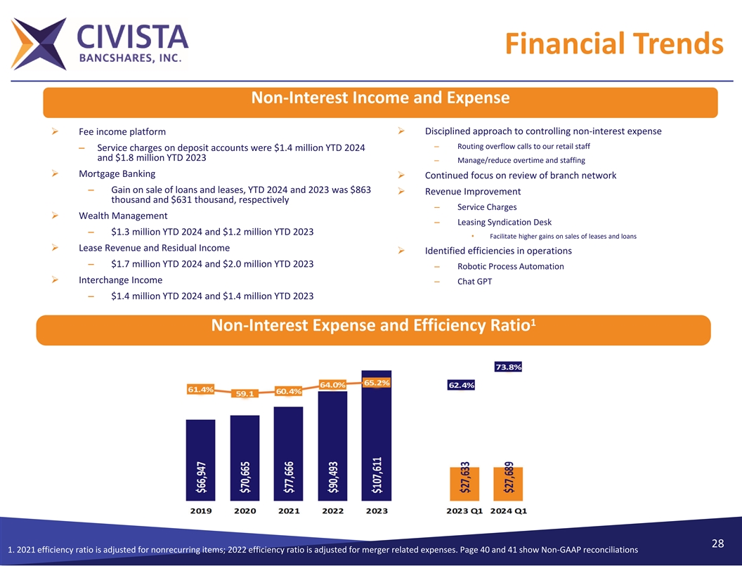 Financial Trends Net Interest Margin 4.31% 3.81% 3.80% 3.75% 3.74% 3.70% 3.70% 3.70% 3.66% 3.50% 3.47% 3.47% 3.45% 3.39% 3.31% 3.32% 3.22% 3.03% 2019Y 2020Y 2021Y 2022Y 2023Y 2024Q1 CIVB Peer Median Peer Top Quartile 2024 peer data as of 3/31/2024, or the latest available date. 27 Note: Comparable peers include public banks $1‐$4B in Ohio and +/‐40% CIVB’s asset size in contiguous states.