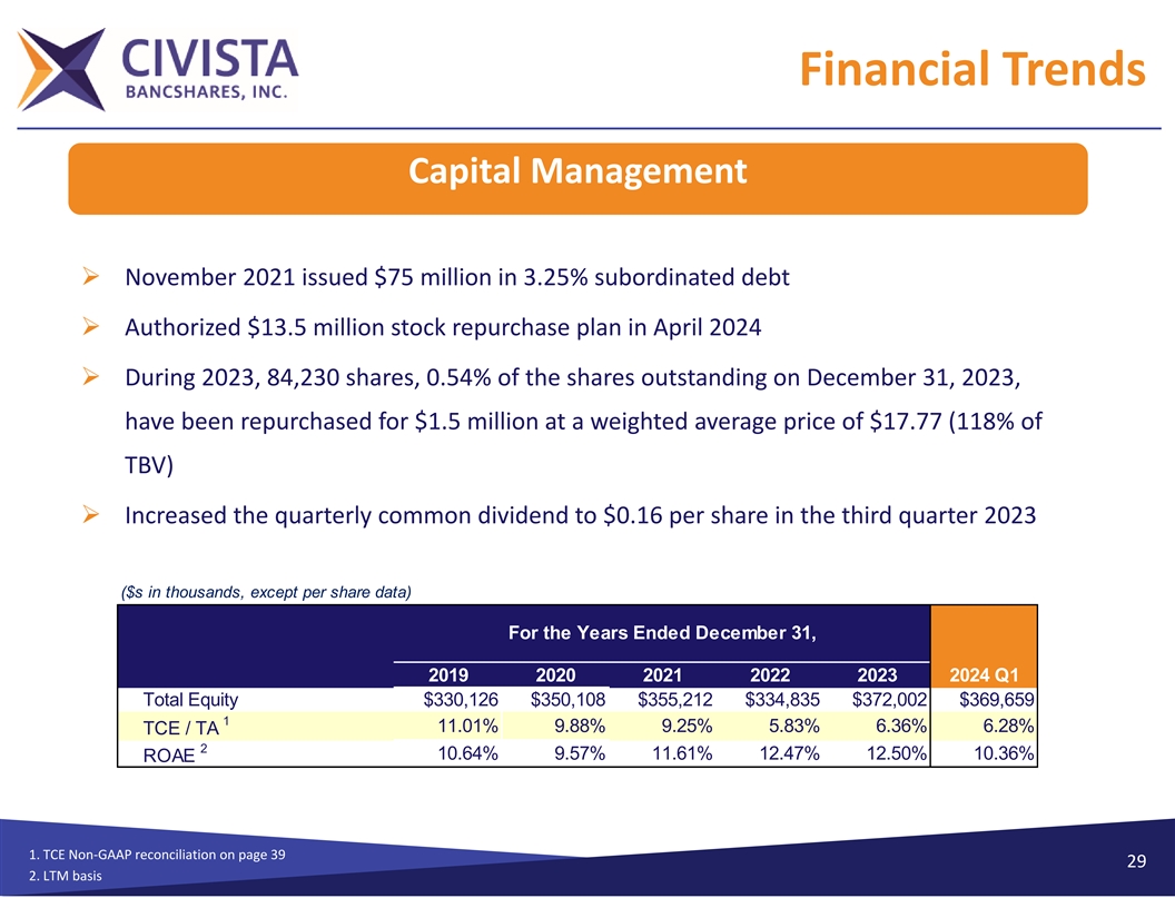 Financial Trends Non‐Interest Income and Expense Ø Fee income platformØ Disciplined approach to controlling non‐interest expense – Routing overflow calls to our retail staff – Service charges on deposit accounts were $1.4 million YTD 2024 and $1.8 million YTD 2023 – Manage/reduce overtime and staffing Ø Mortgage Banking Ø Continued focus on review of branch network – Gain on sale of loans and leases, YTD 2024 and 2023 was $863 Ø Revenue Improvement thousand and $631 thousand, respectively – Service Charges Ø Wealth Management – Leasing Syndication Desk – $1.3 million YTD 2024 and $1.2 million YTD 2023 • Facilitate higher gains on sales of leases and loans Ø Lease Revenue and Residual Income Ø Identified efficiencies in operations – $1.7 million YTD 2024 and $2.0 million YTD 2023 – Robotic Process Automation Ø Interchange Income – Chat GPT – $1.4 million YTD 2024 and $1.4 million YTD 2023 1 Non‐Interest Expense and Efficiency Ratio 28 1. 2021 efficiency ratio is adjusted for nonrecurring items; 2022 efficiency ratio is adjusted for merger related expenses. Page40 and 41 show Non‐GAAP reconciliations
