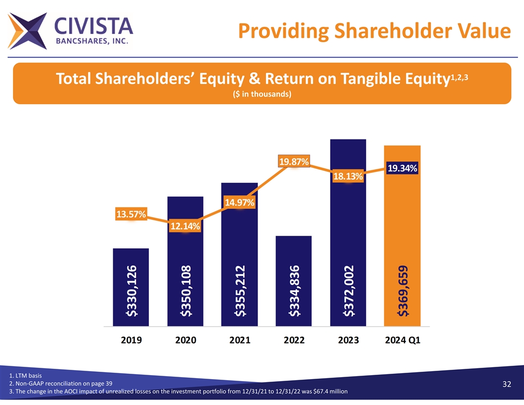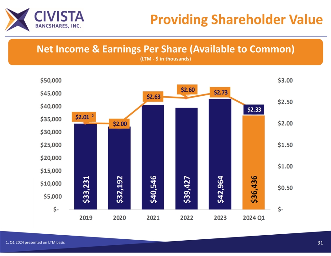 Providing Shareholder Value Net Income & Earnings Per Share (Available to Common) (LTM ‐$ in thousands) 1. Q1 2024 presented on LTM basis 31