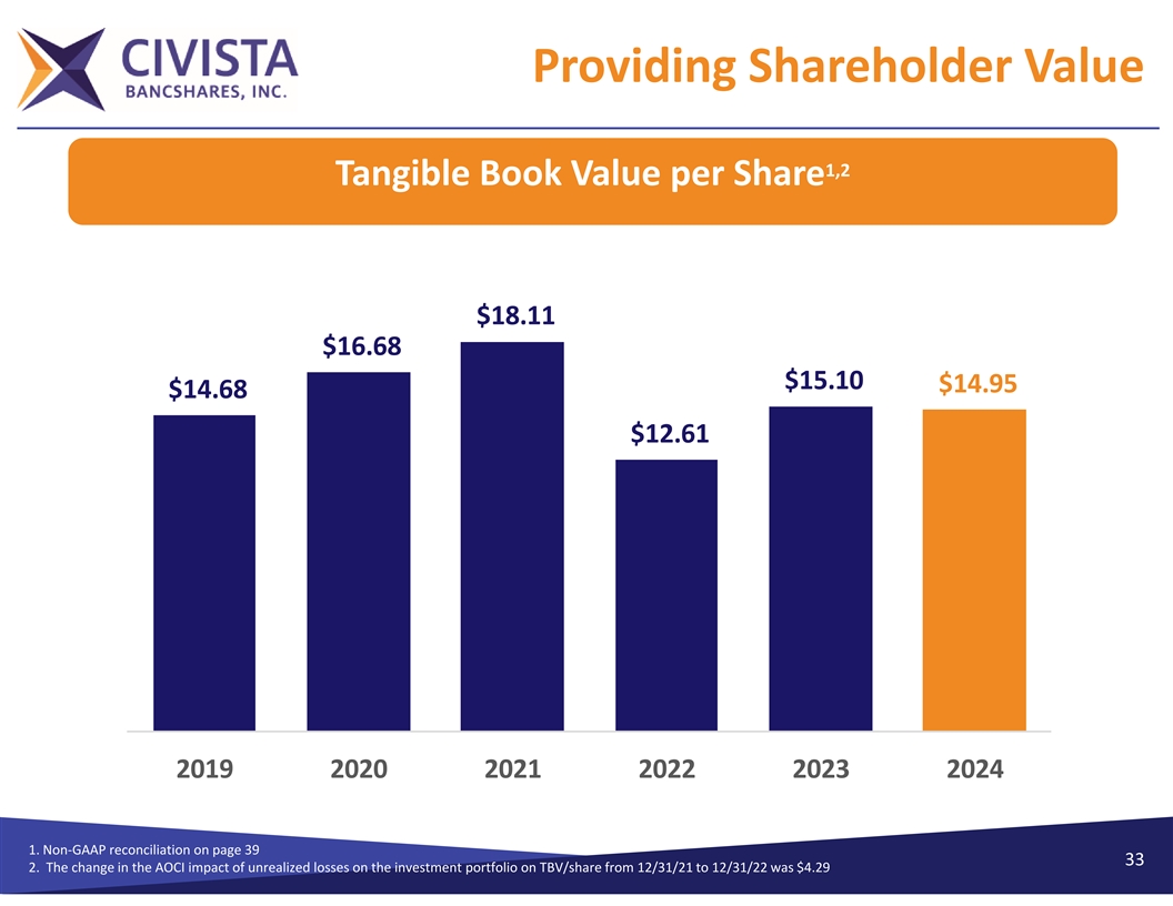 Providing Shareholder Value 1,2,3 Total Shareholders’ Equity & Return on Tangible Equity ($ in thousands) 1. LTM basis 2. Non‐GAAP reconciliation on page 39 32 3. The change in the AOCI impact of unrealized losses on the investment portfolio from 12/31/21 to 12/31/22 was $67.4 million