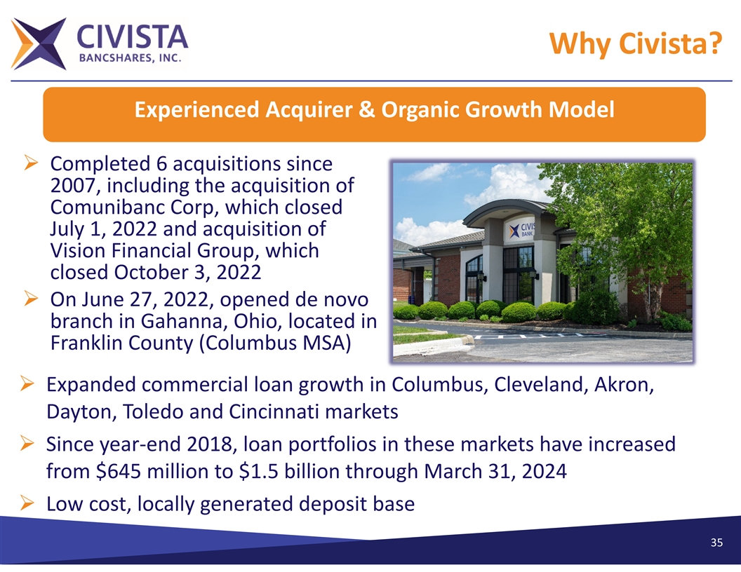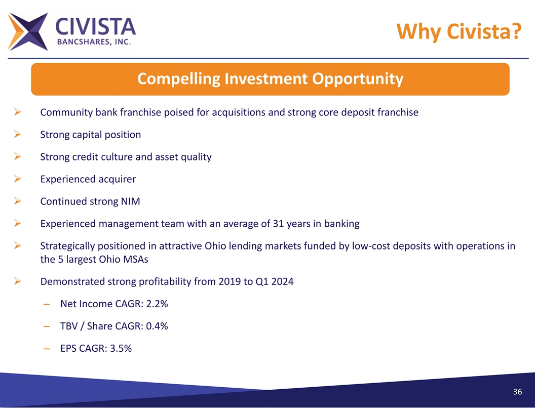Why Civista? Experienced Acquirer & Organic Growth Model Ø Completed 6 acquisitions since 2007, including the acquisition of Comunibanc Corp, which closed July 1, 2022 and acquisition of Vision Financial Group, which closed October 3, 2022 Ø On June 27, 2022, opened de novo branch in Gahanna, Ohio, located in Franklin County (Columbus MSA) Ø Expanded commercial loan growth in Columbus, Cleveland, Akron, Dayton, Toledo and Cincinnati markets Ø Since year‐end 2018, loan portfolios in these markets have increased from $645 million to $1.5 billion through March 31, 2024 Ø Low cost, locally generated deposit base 35