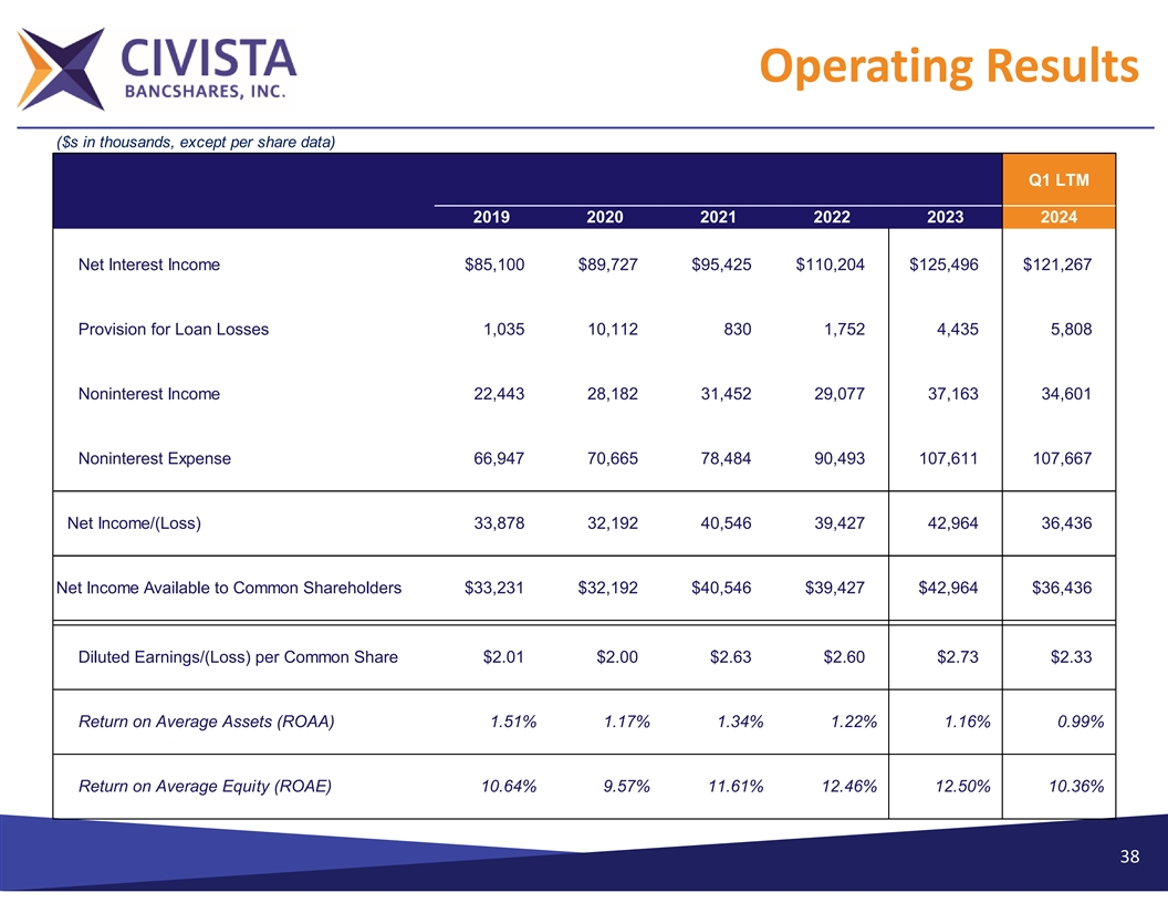 Operating Results ($s in thousands, except per share data) Q1 LTM 2019 2020 2021 2022 2023 2024 Net Interest Income $85,100 $89,727 $95,425 $110,204 $125,496 $121,267 Provision for Loan Losses 1,035 10,112 830 1,752 4,435 5,808 Noninterest Income 22,443 28,182 31,452 29,077 37,163 34,601 Noninterest Expense 66,947 70,665 78,484 90,493 107,611 107,667 Net Income/(Loss) 33,878 32,192 40,546 39,427 42,964 36,436 Net Income Available to Common Shareholders $33,231 $32,192 $40,546 $39,427 $42,964 $36,436 Diluted Earnings/(Loss) per Common Share $2.01 $2.00 $2.63 $2.60 $2.73 $2.33 Return on Average Assets (ROAA) 1.51% 1.17% 1.34% 1.22% 1.16% 0.99% Return on Average Equity (ROAE) 10.64% 9.57% 11.61% 12.46% 12.50% 10.36% 38