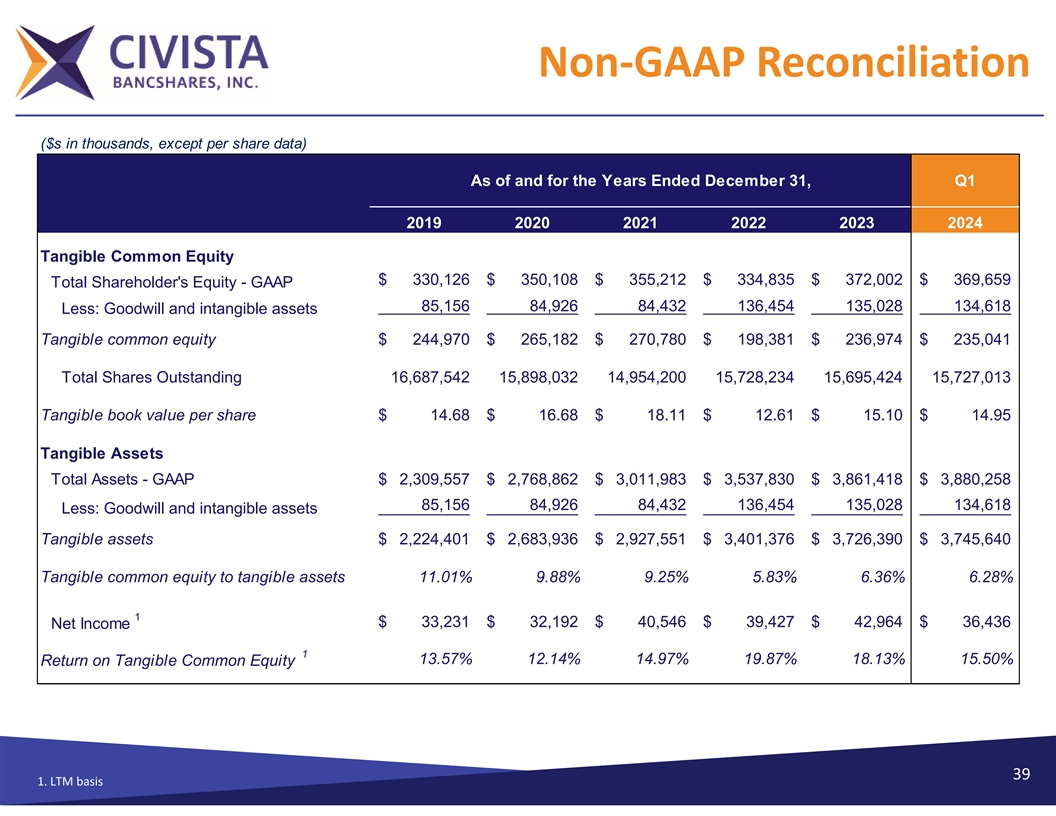 Non‐GAAP Reconciliation ($s in thousands, except per share data) As of and for the Years Ended December 31, Q1 2019 2020 2021 2022 2023 2024 Tangible Common Equity $ 330,126 $ 350,108 $ 355,212 $ 334,835 $ 372,002 $ 369,659 Total Shareholder's Equity - GAAP 85,156 84,926 84,432 136,454 135,028 134,618 Less: Goodwill and intangible assets Tangible common equity $ 244,970 $ 265,182 $ 270,780 $ 198,381 $ 236,974 $ 235,041 Total Shares Outstanding 16,687,542 15,898,032 14,954,200 15,728,234 15,695,424 15,727,013 Tangible book value per share $ 14.68 $ 16.68 $ 18.11 $ 12.61 $ 15.10 $ 14.95 Tangible Assets Total Assets - GAAP $ 2,309,557 $ 2,768,862 $ 3,011,983 $ 3,537,830 $ 3,861,418 $ 3,880,258 84,926 85,156 84,432 136,454 135,028 134,618 Less: Goodwill and intangible assets Tangible assets $ 2,224,401 $ 2,683,936 $ 2,927,551 $ 3,401,376 $ 3,726,390 $ 3,745,640 Tangible common equity to tangible assets 11.01% 9.88% 9.25% 5.83% 6.36% 6.28% 1 $ 33,231 $ 32,192 $ 40,546 $ 39,427 $ 42,964 $ 36,436 Net Income 1 13.57% 12.14% 14.97% 19.87% 18.13% 15.50% Return on Tangible Common Equity 39 1. LTM basis