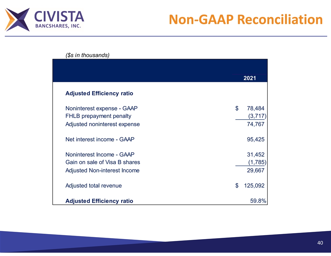 Non‐GAAP Reconciliation ($s in thousands) 2021 Adjusted Efficiency ratio Noninterest expense - GAAP $ 78,484 FHLB prepayment penalty (3,717) Adjusted noninterest expense 74,767 Net interest income - GAAP 95,425 Noninterest Income - GAAP 31,452 Gain on sale of Visa B shares (1,785) Adjusted Non-interest Income 29,667 Adjusted total revenue $ 125,092 Adjusted Efficiency ratio 59.8% 40